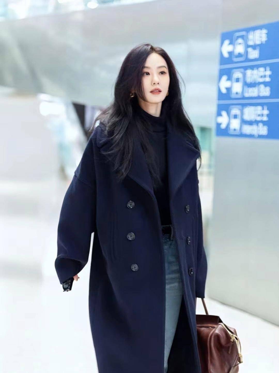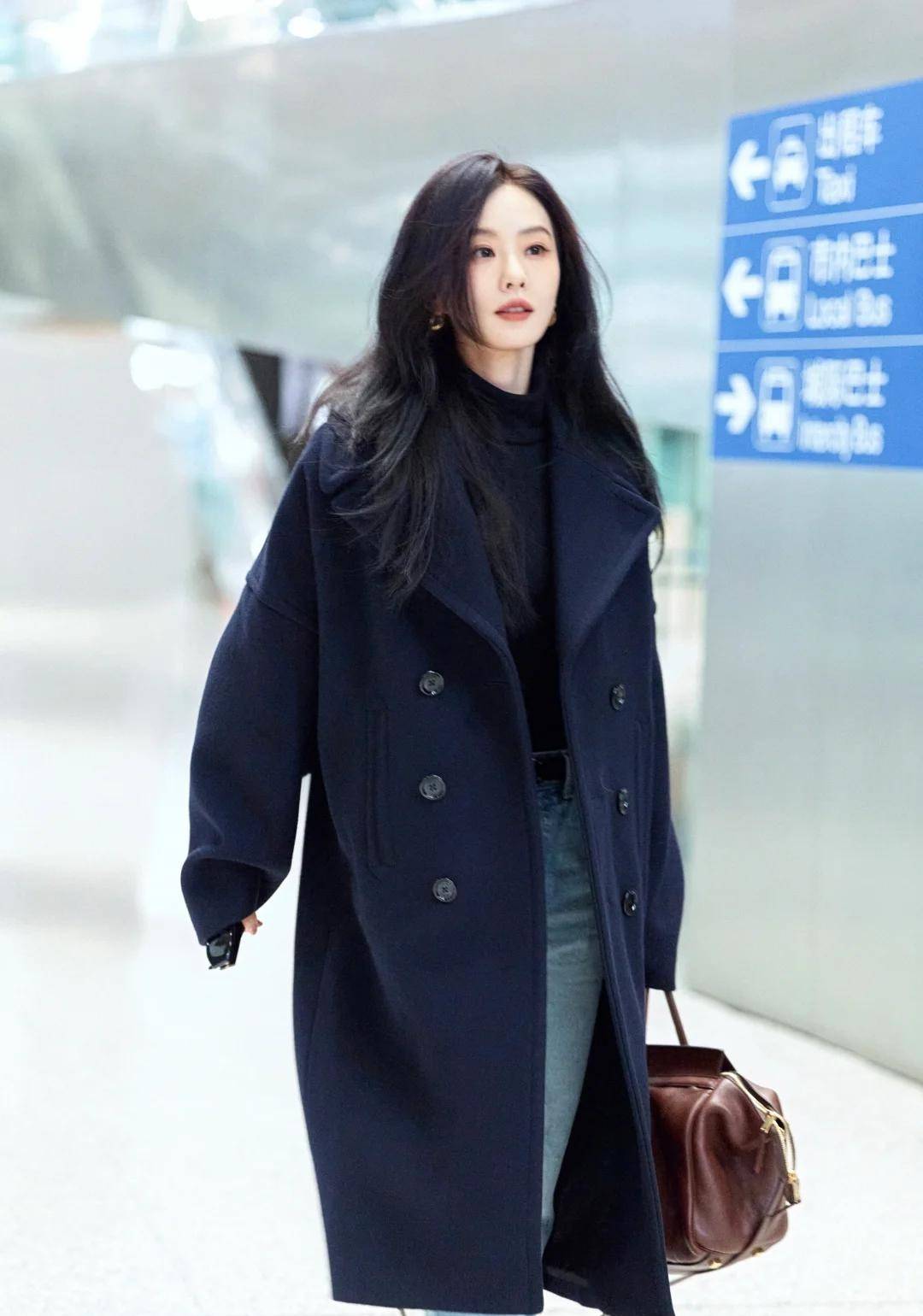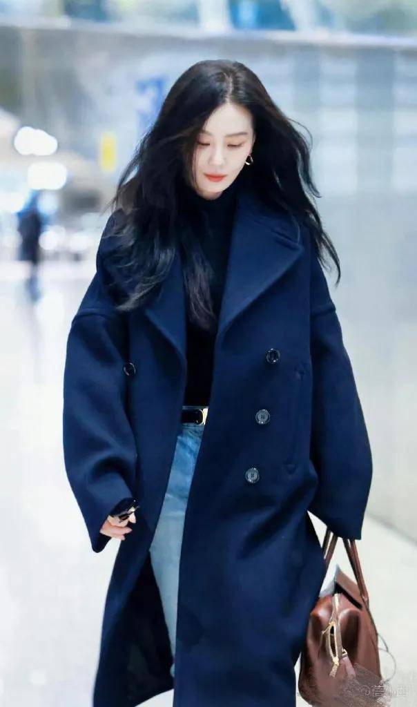 刘诗诗将普通单品组合出特殊效果。深蓝色大衣与黑色高领衫形成色彩层次。浅蓝色牛仔裤打破深色系沉闷,增添年轻感和休闲感。黑色短靴保持造型连贯性,增加利落感。