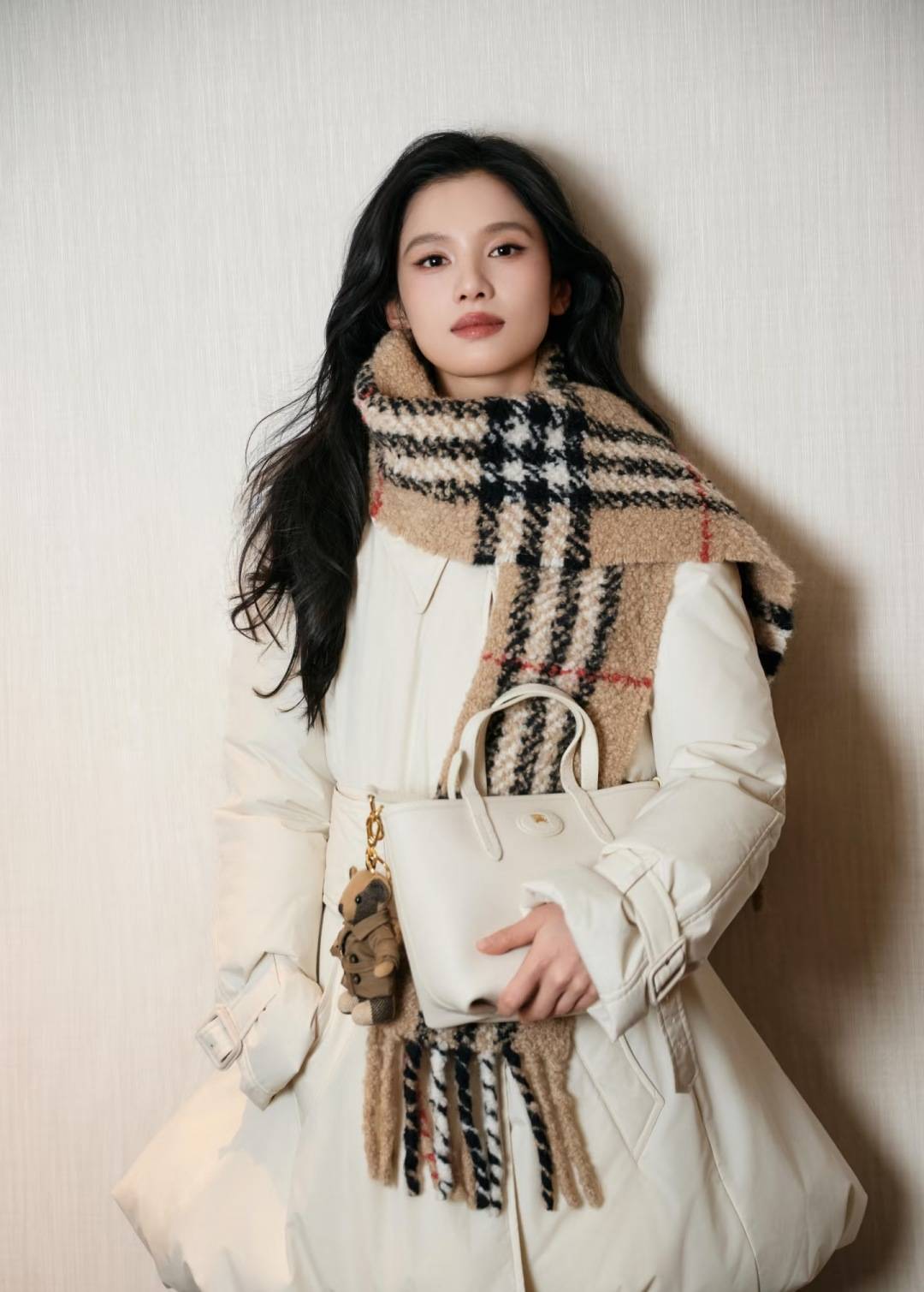 选择收腰设计:如张婧仪的Burberry花苞感羽绒服,突出腰线;