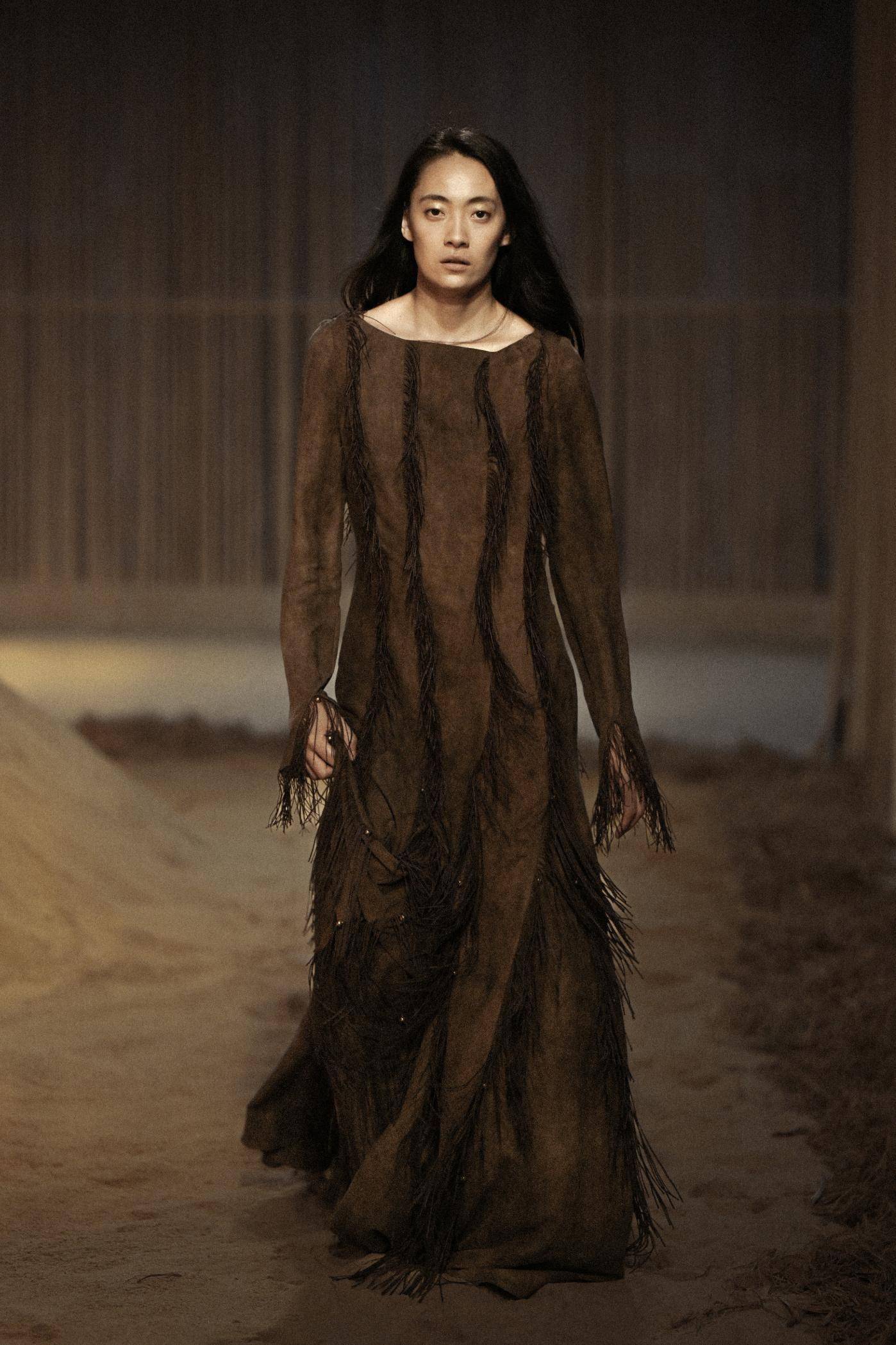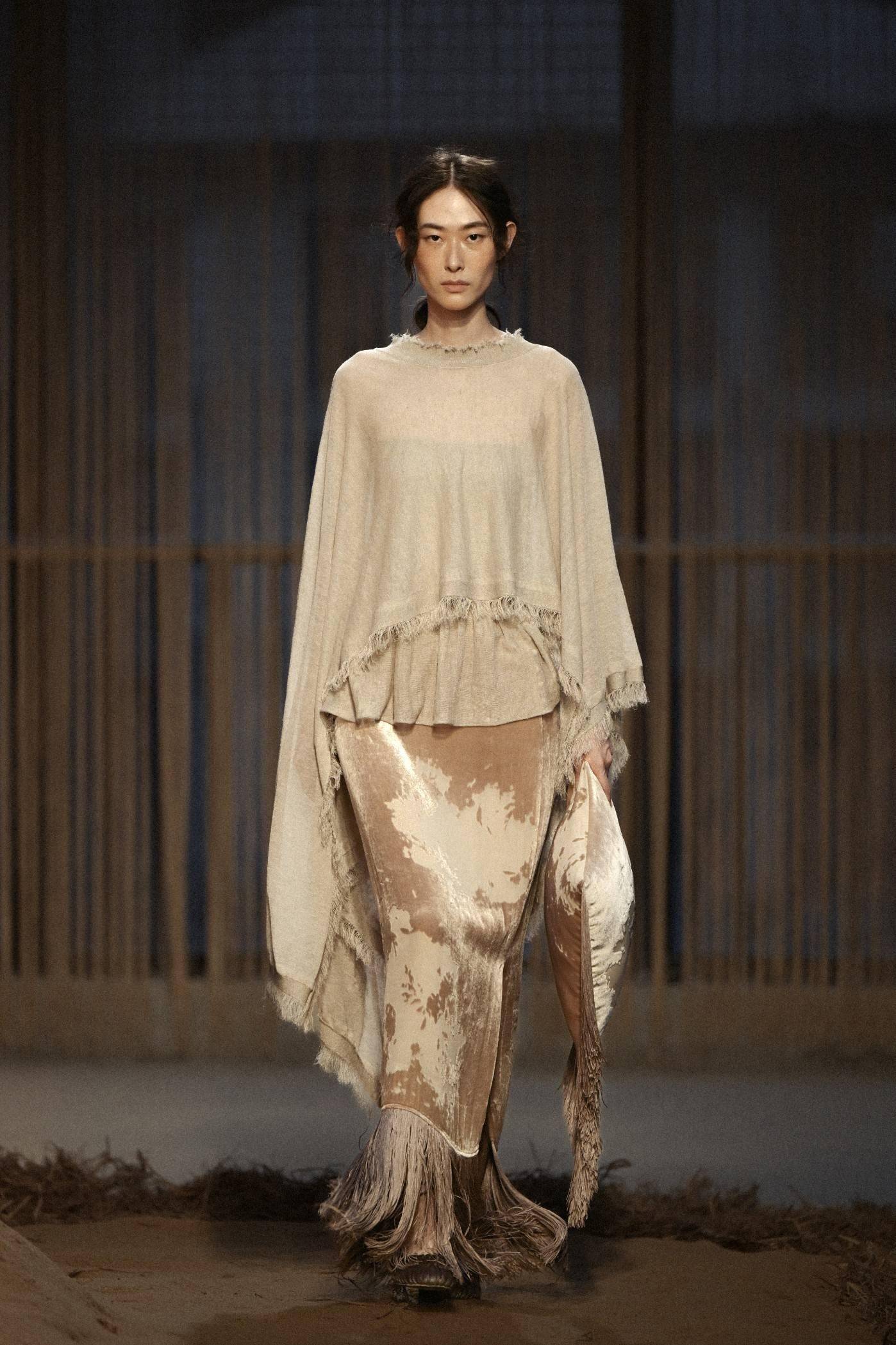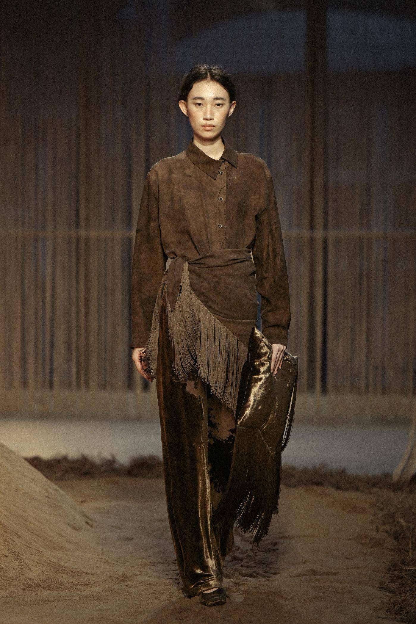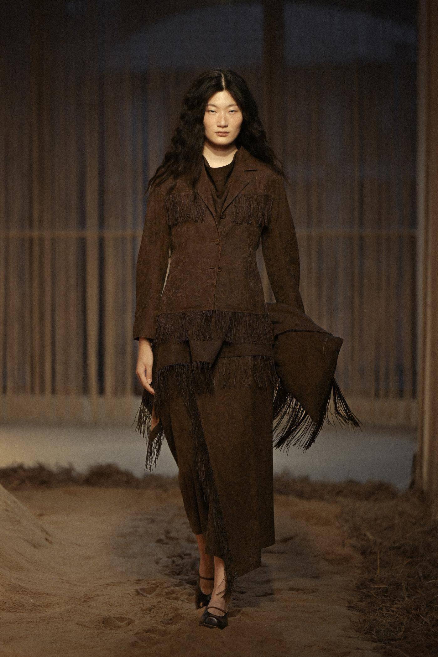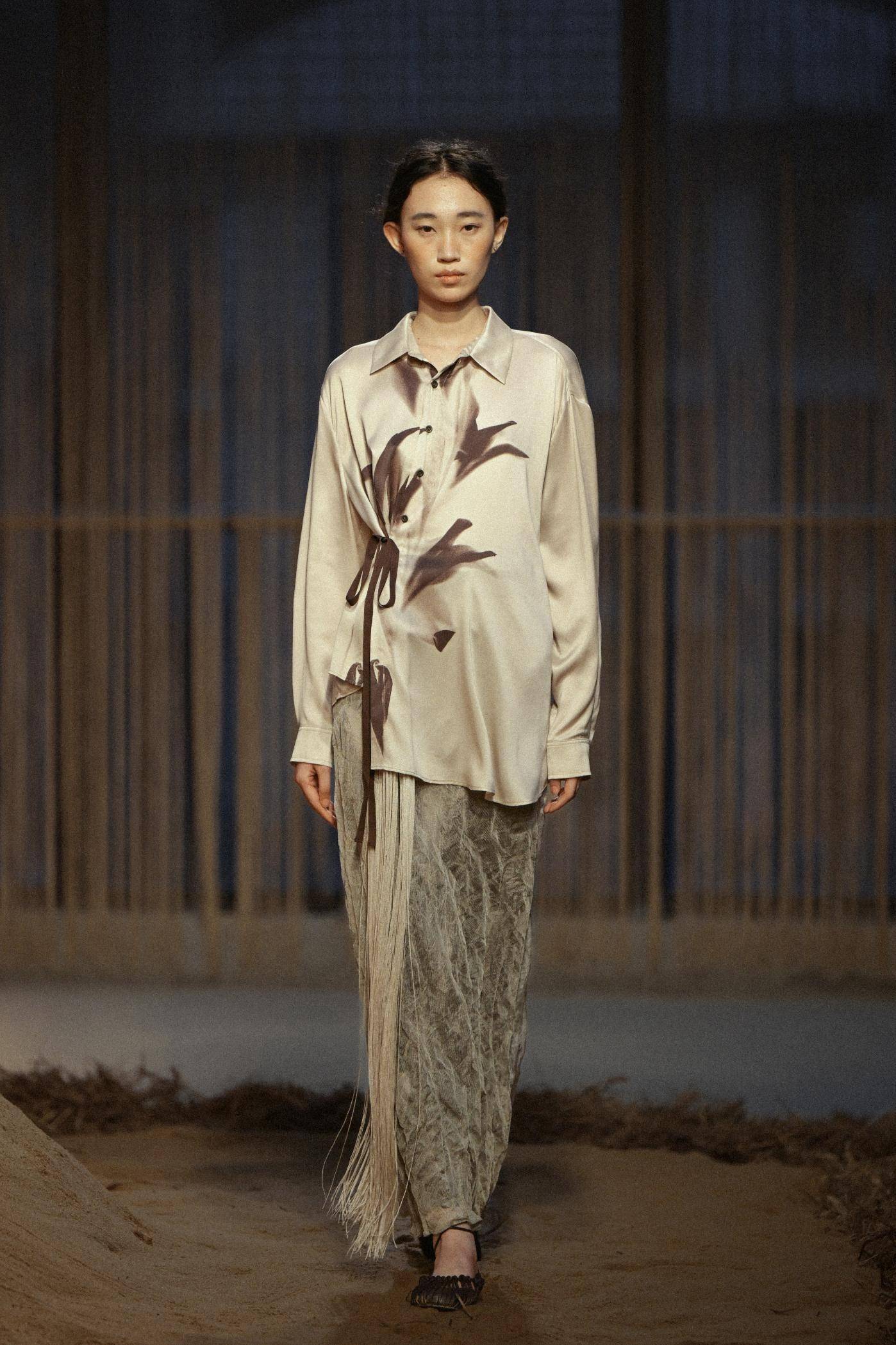 本季,设计师采用亚麻、苎麻与真丝等天然材质描摹三毛的精神轨迹,在粗粝与细腻、东方与西方、自然与人文的交错中,勾勒出一幅关于勇气与温柔并存的生命图景。柿染真丝与传统泥染工艺的香云纱提花,铺陈出大地的温度;亮片羽饰与毛边织物层叠交织,如手稿间隐约闪现的情绪笔痕;和纸纱质地的轻盈飘逸,宛若三毛的文字,在脆弱中生出韧性。