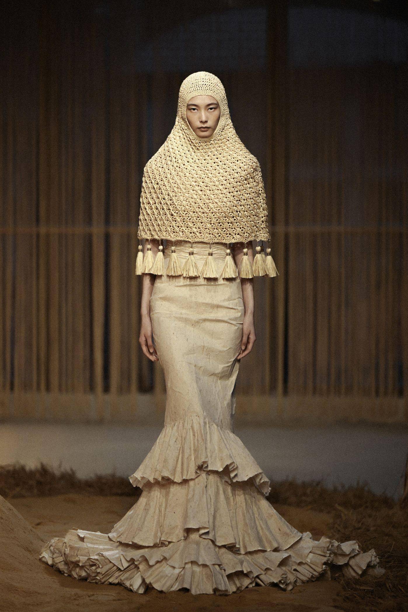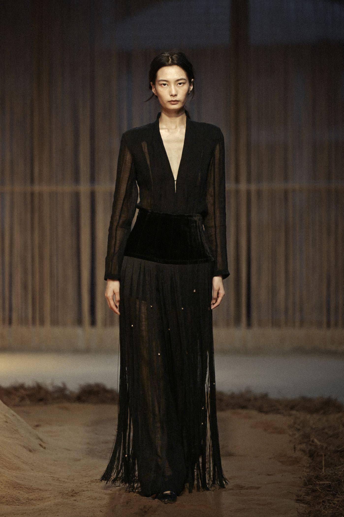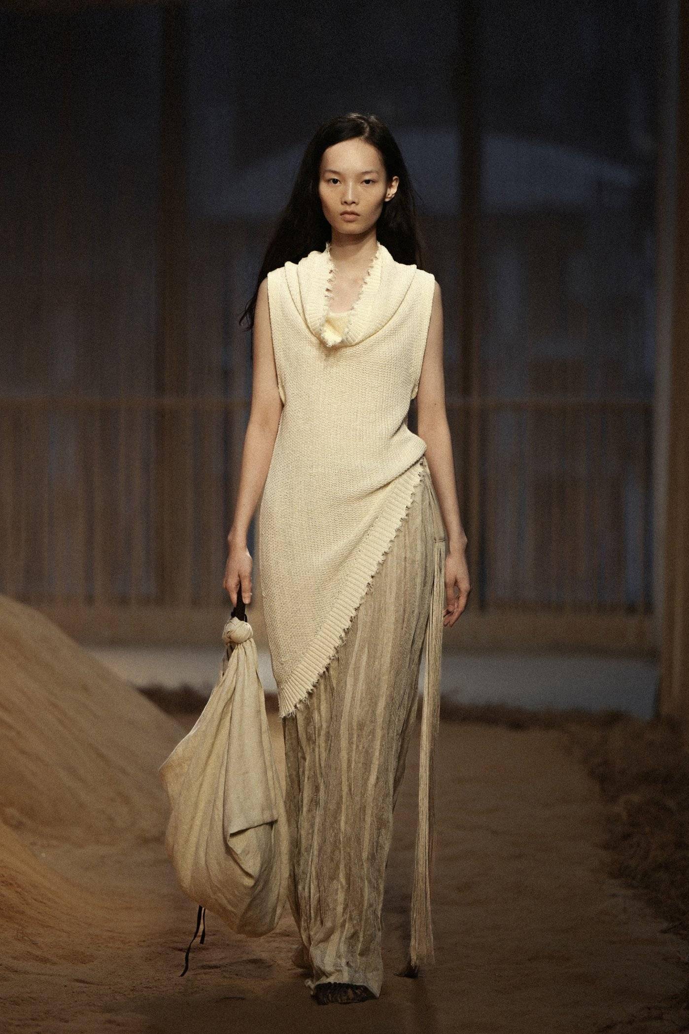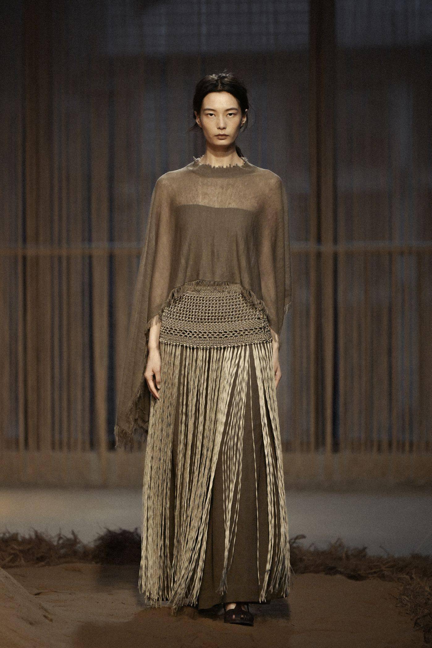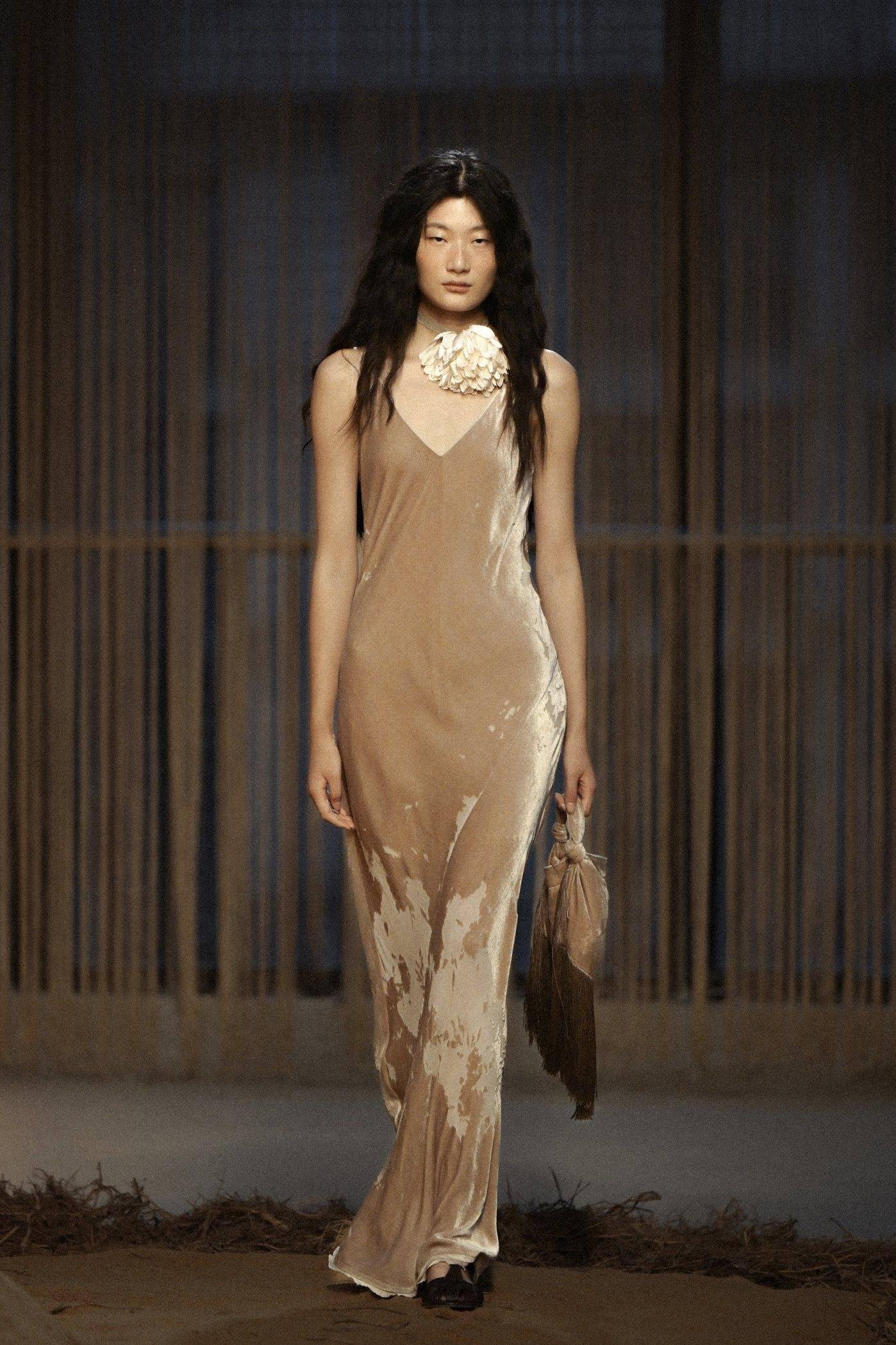 本季,设计师采用亚麻、苎麻与真丝等天然材质描摹三毛的精神轨迹,在粗粝与细腻、东方与西方、自然与人文的交错中,勾勒出一幅关于勇气与温柔并存的生命图景。柿染真丝与传统泥染工艺的香云纱提花,铺陈出大地的温度;亮片羽饰与毛边织物层叠交织,如手稿间隐约闪现的情绪笔痕;和纸纱质地的轻盈飘逸,宛若三毛的文字,在脆弱中生出韧性。
