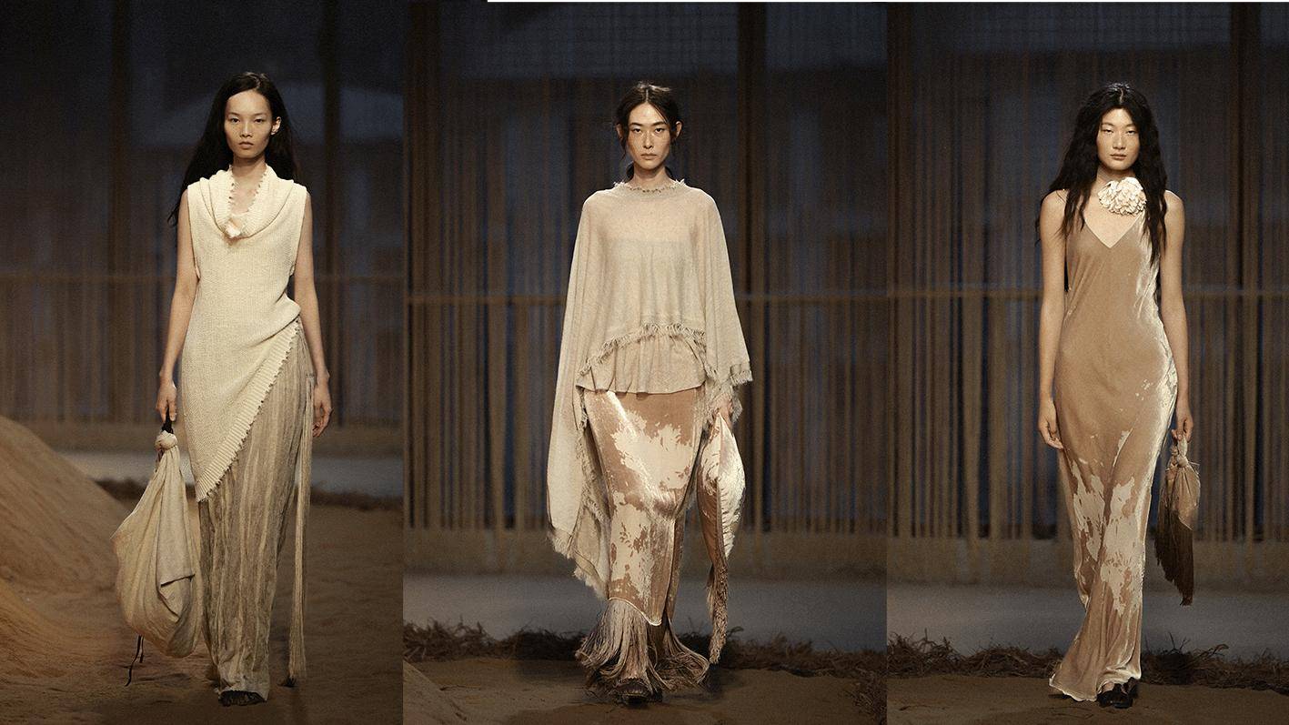 本次大秀获得上海西班牙文化中心——塞万提斯学院的特别支持。秀场以弗拉门戈音乐为引,唤起三毛的自由灵魂,秀场中央的沙堆象征她热烈的撒哈拉记忆,舞蹈艺术家董继兰以沙为画布、以肢体为笔,在飞扬的沙尘间演绎生命的来去与灵魂的延续。