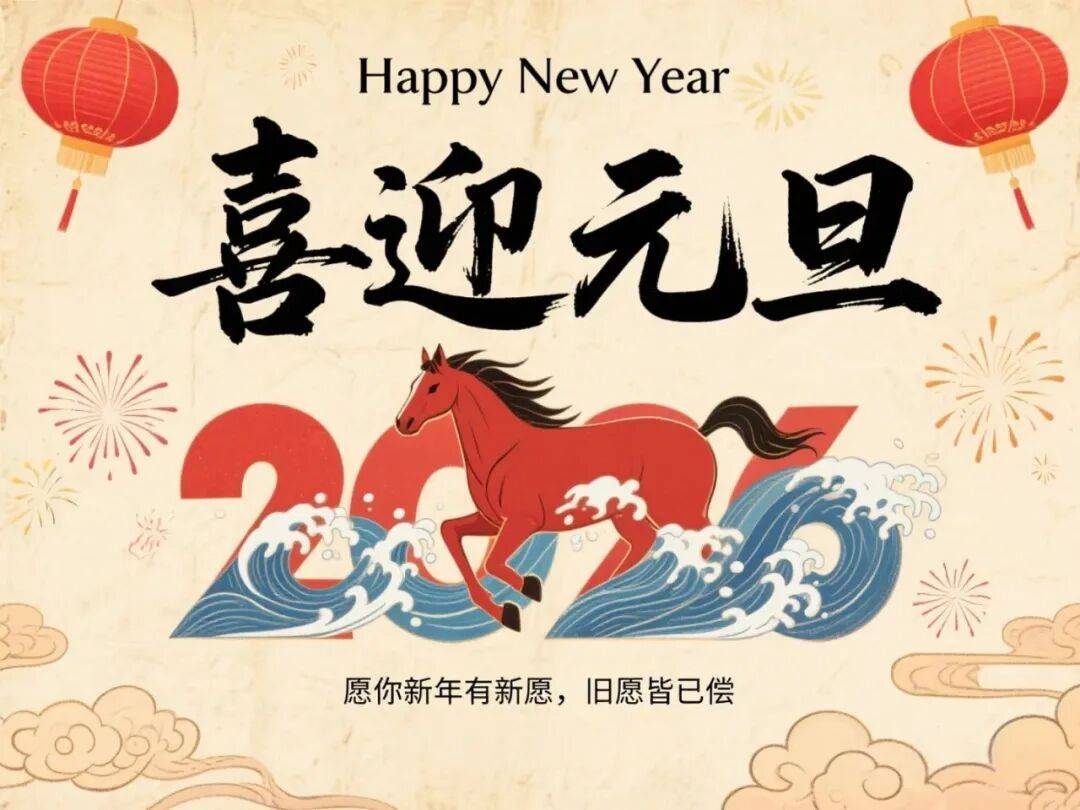 | 🖼️ 图片1 | 米黄底色、红灯笼、奔马踏浪、毛笔字“喜迎元旦” | 温暖、希望、奋发向上 | “鼓气扬帆,走进新的一天”<br>→ 奔马如你我勇往直前 |