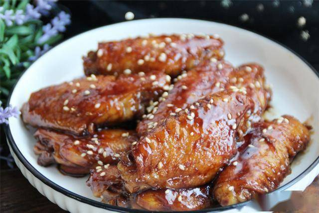 🍽️ 摆盘风格:黑边白盘衬托棕红色鸡翅,顶部撒白芝麻,背景点缀紫花与黑色台面(如图5),现代又不失年味。