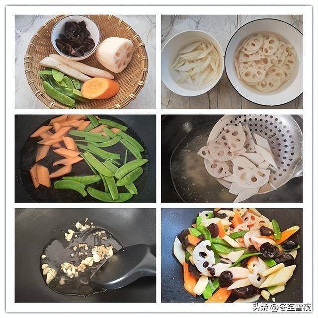 【荷塘小炒】所需材料:莲藕半根、山药半根、荷兰豆适量、胡萝卜1段、木耳半碗、油盐适量、姜1片、大蒜3瓣、鸡精1茶匙、水淀粉适量、