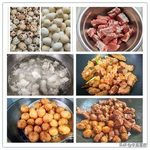 【鹌鹑蛋烧排骨】所需材料:排骨 500 克、鹌鹑蛋 300 克、生姜一块、大蒜 2 瓣、大葱一段、冰糖 20 克、生抽 2 勺、老抽1 勺、料酒 2 勺、花椒10粒、八角 2 个、桂皮1 小块、香叶 2 片、油、盐和鸡精适量。