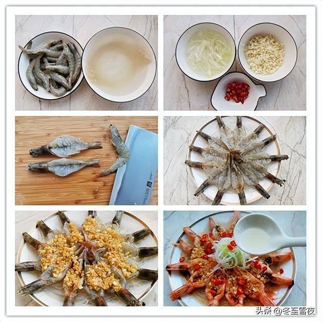 🖼️ 艺术呈现:图6中虾头向外排列成花状,蒜蓉覆盖,粉丝打底,红椒点染,绿葱提亮;图7完整展示从备料到浇油全过程,极具指导性。