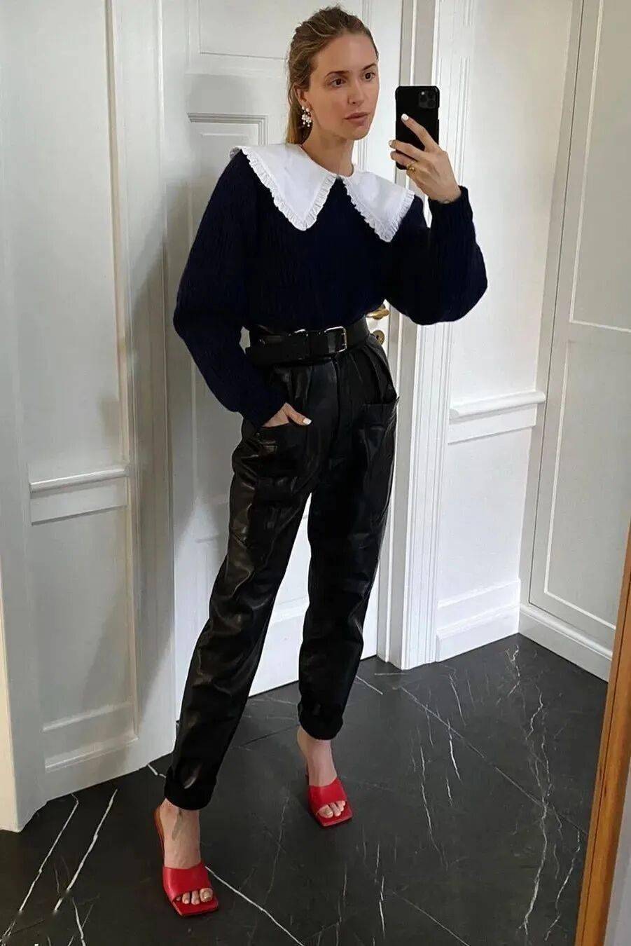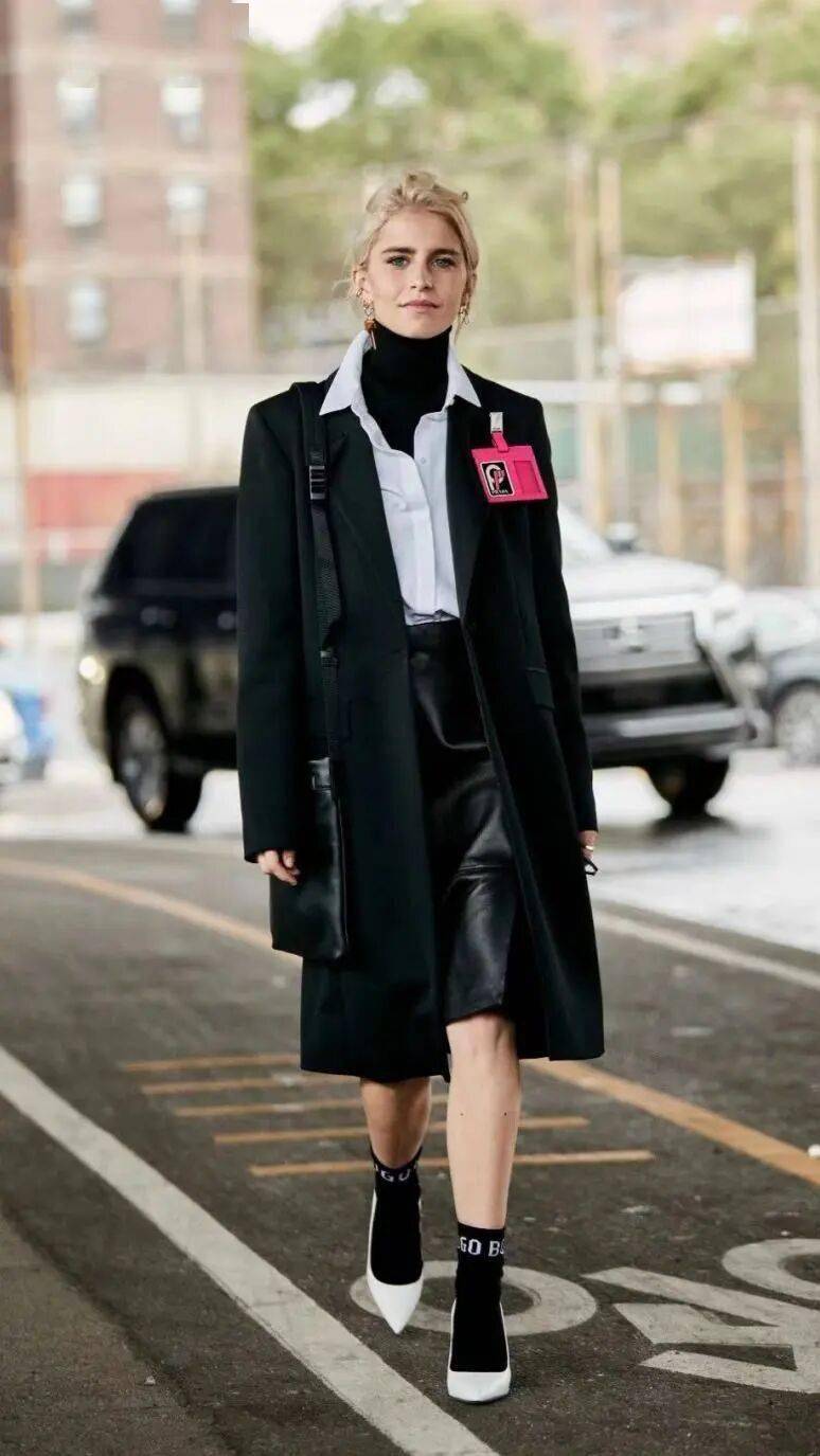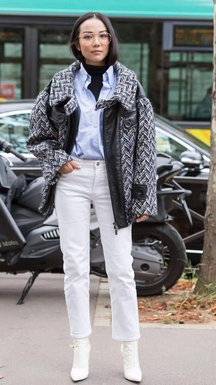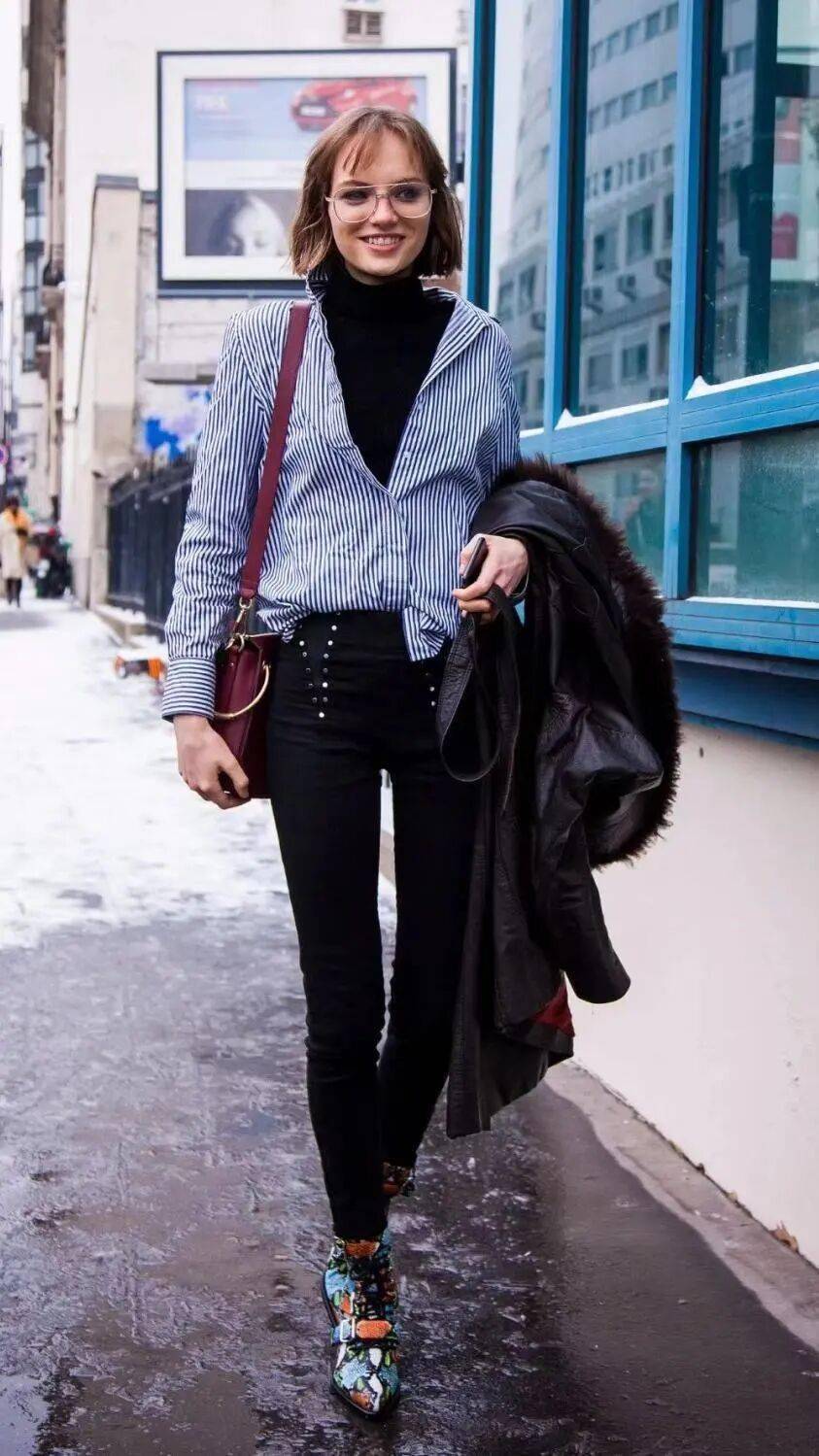 内紧外松:修身黑色/白色高领打底衫作底层,避免臃肿;中间层选挺括衬衫(如浅蓝、条纹),解开1-2颗扣子形成V领,拉长颈部线条。