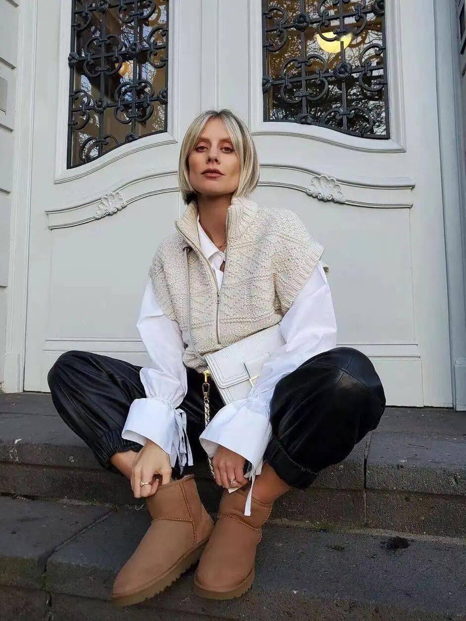 三层保暖不臃肿:修身打底衫作基础层,中间衬衫选薄款(真丝/雪纺),外层宽松毛衣(V领或圆领)。