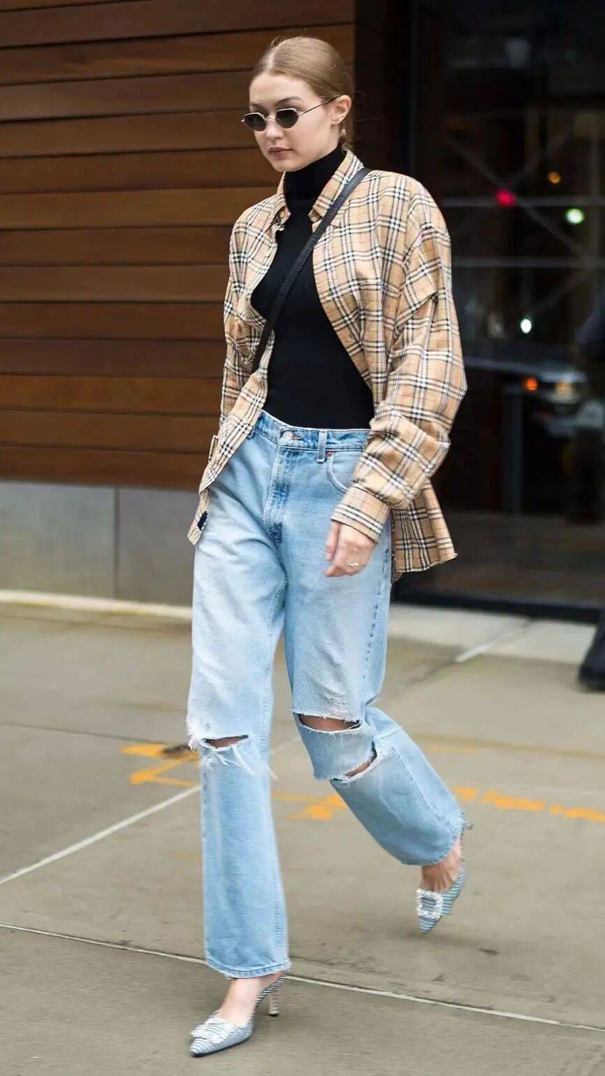 显瘦关键:深色打底衫收缩视觉,衬衫塞进高腰裤优化比例。