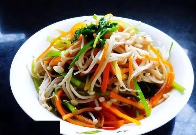 1、金针菇用开水焯一下,捞出控干水分;