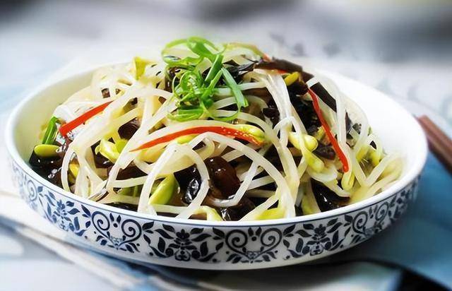 食材:黄豆芽350克、木耳150克、小葱3根、辣椒1只、姜1片、花椒20粒、酱油1汤匙、料酒半汤匙、醋1汤匙、盐适量、油适量