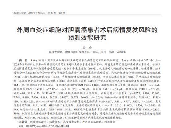 [1] 外周血炎症细胞对胆囊癌患者术后病情复发风险的预测效能研究 孟瑜 黑龙江医学 2025-04-25