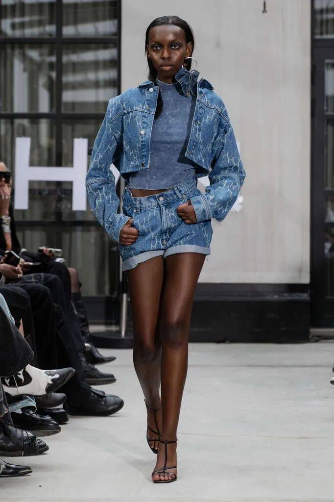 蓝色系颜色的服装在色彩对比的搭配增加了花纹图案的活力艺术感,而夹克上衣和短裤之间的搭配,也多了休闲利落的时髦气质;而短款的牛仔夹克也在拉高的腰线中,增加了一些小蛮腰的线条感;