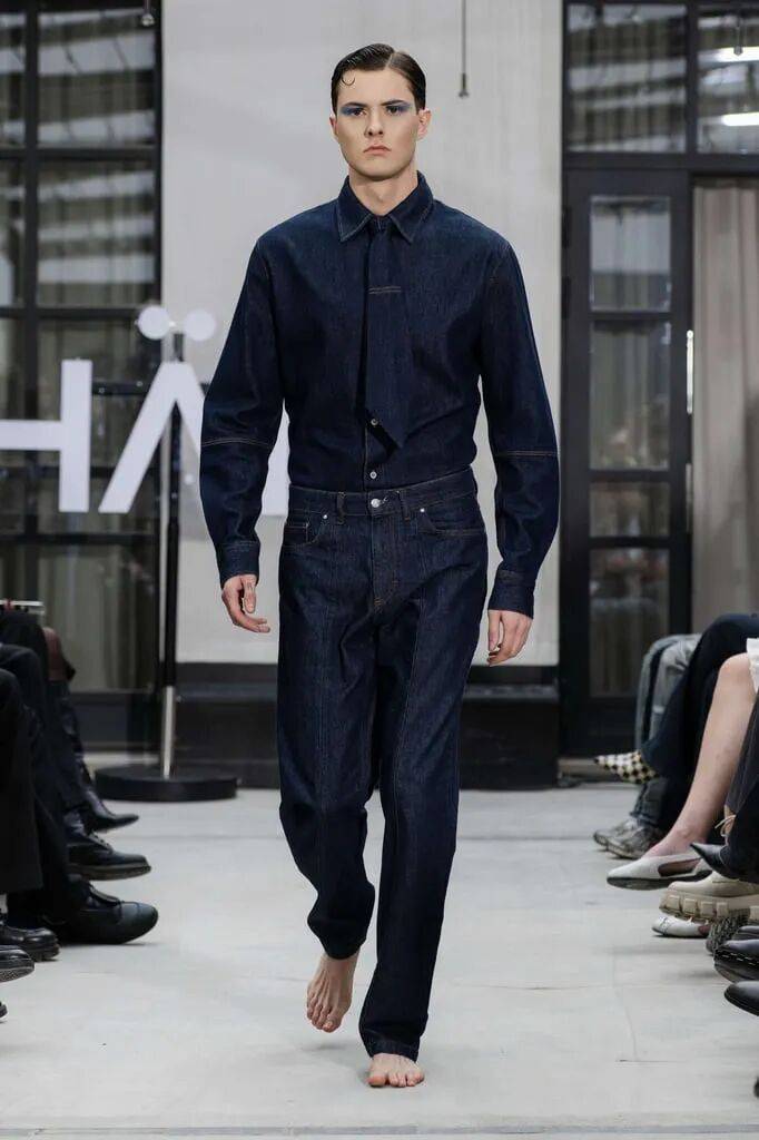 在套装为主的服装上,蓝色系的颜色和牛仔面料结合让穿搭也多了不少的休闲日常的时尚感,休闲夹克上衣的帅气,也在同色系不同色彩增加了花纹图案的活力艺术感;还有花纹和纯色的拼接搭配形成了视觉的对比,也有领带的搭配也多了整体感的日常气质。