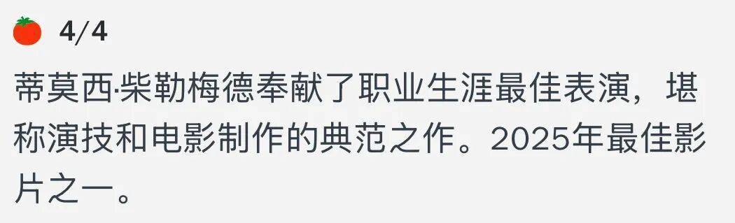 烂番茄新鲜度94%,IMDb评分8.3,Metacritic评分88分,IGN打出9分高分,被评价为“2025年最好的电影之一”。