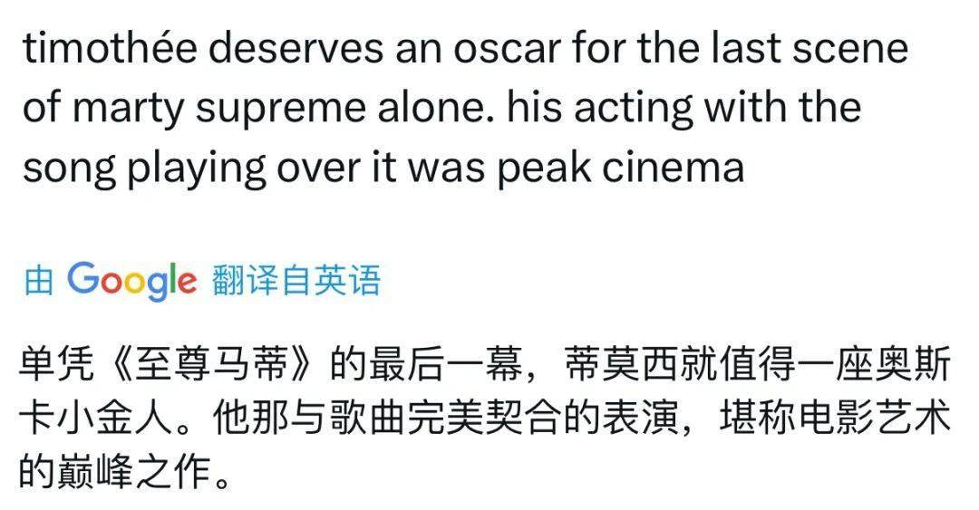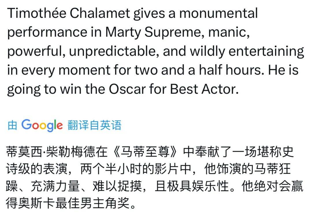 《至尊马蒂》的冲奥希望:凭借该片再次冲击奥斯卡,影片独特的体育+抓马风格、萨弗迪兄弟强烈的导演风格,以及甜茶的突破性表演,使其成为颁奖季热门。