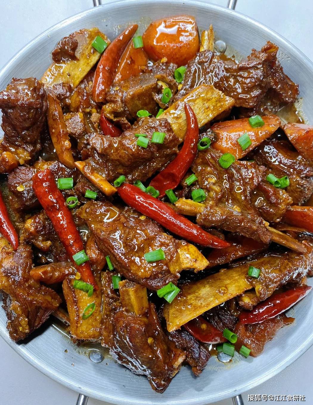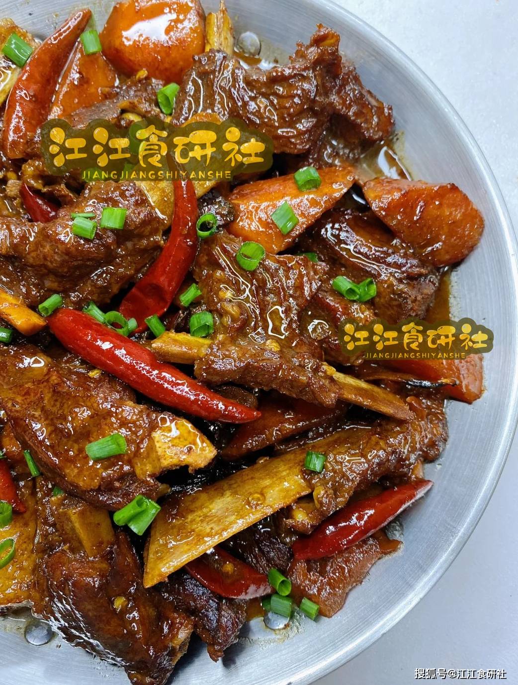 图片5:展示了一盘红烧胡萝卜羊排,羊排色泽红亮,表面附着浓稠酱汁,其上点缀着绿色葱花和红色辣椒,还能看到一些胡萝卜块,菜品被盛放在一个浅色碗中,碗上方有“江江食研社”字样的标识。