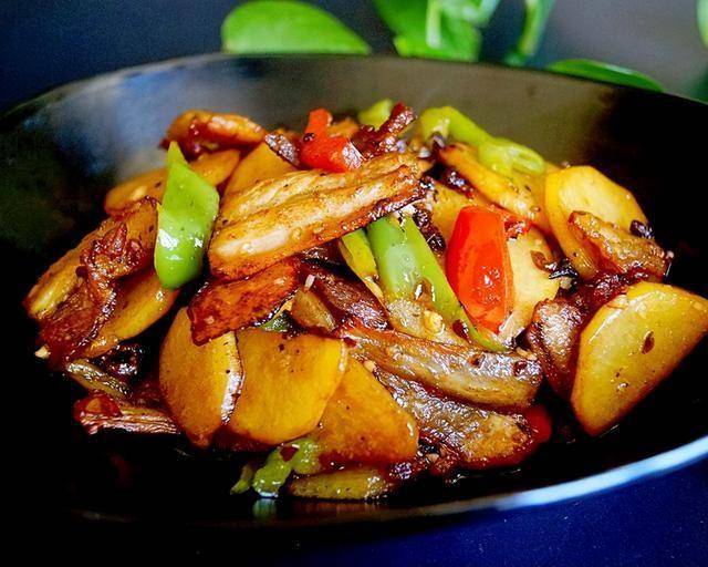 下入煮好的土豆片和青红椒继续翻炒,让五花肉的油脂煸一会土豆片,关火加入蒜末即可出锅。