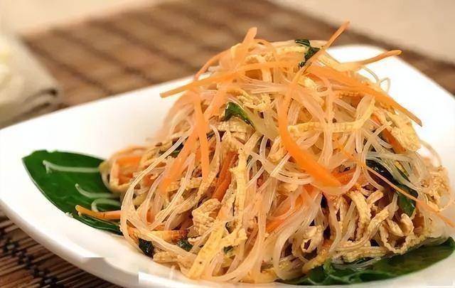 2、热锅倒入一点点油,油温5成热时,放入胡萝卜丝,用中火炒至颜色变深后,盛出,和豆腐丝一起放入容器中。