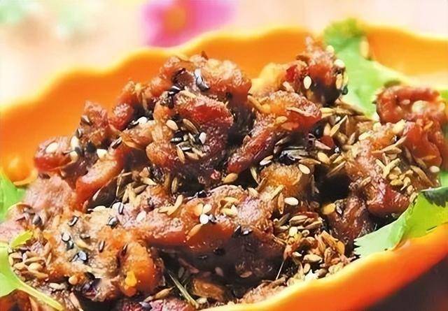 4.中火再次烧热炒锅,加入油烧热,放入剩余的孜然粒翻炒片刻,倒入腌好的洋葱羊肉快速翻炒均匀,最后,调入辣椒粉和盐拌炒均匀即可出锅。