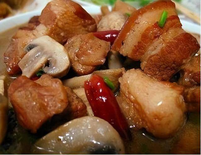 食材:蘑菇、猪肉、葱姜、干辣椒、油、酱油、料酒、盐