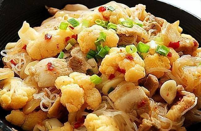 4、再加入白糖炒匀,盖上锅盖用小火焖至菜花软烂。待菜花软烂后,倒入粉丝炒匀。加入鸡精调味。
