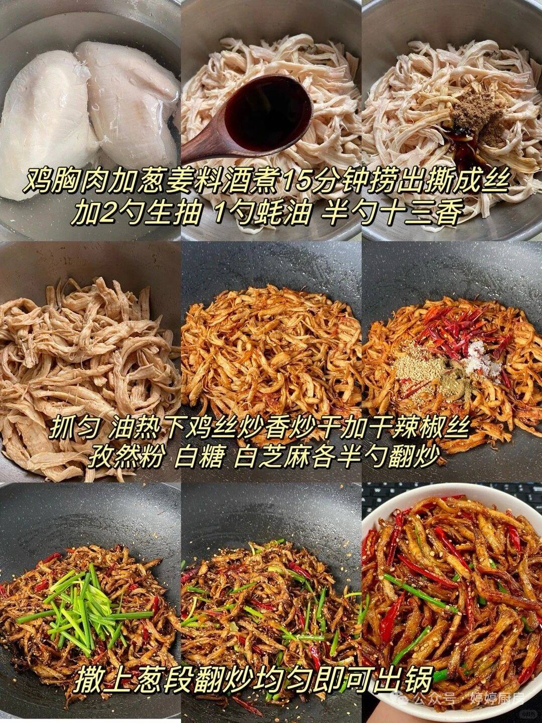 这道菜的灵魂就是“手撕”和“拌汁”!鸡胸肉冷水下锅,加姜片、料酒煮15分钟,关火焖5分钟,这样肉嫩到离谱。捞出来过凉水,顺着纹理撕成细丝,这一步千万别用刀切,手撕的鸡丝更入味。调汁是关键:一勺生抽、半勺老抽、一勺香醋、两勺辣椒油、一勺花椒油,再加蒜末、葱花、白芝麻,淋在鸡丝上拌匀,香得隔壁小孩都来敲门!技巧就是煮鸡胸肉时别煮太久,焖熟的肉才不柴,拌汁可以多放辣椒油,麻辣味儿直接拉满。