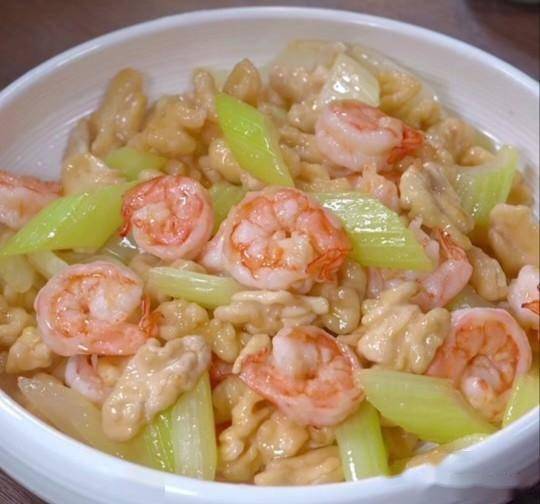 5. 最后将虾仁、核桃倒入锅中,加盐调味,翻炒均匀即可。
