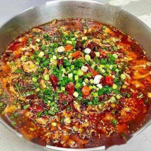 6. 把煮食材的汤水倒入碗中,放上蒜末和炒好的干辣椒、花椒,淋上热油,撒上芝麻、葱花和香菜即可。