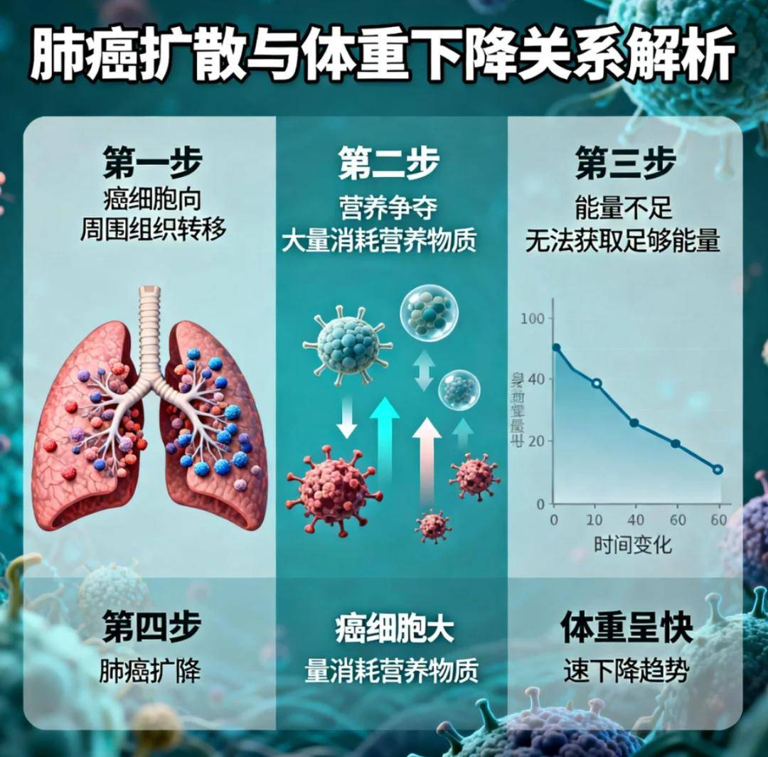 当肺癌扩散时,癌细胞会越来越多,它们消耗的营养也更多,身体得不到足够的能量,体重就会快速下降。