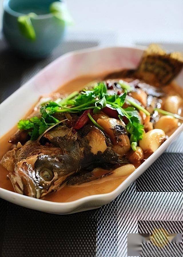 3、重新烧热炒锅入油放入蒜瓣、葱、姜片、花椒、红尖椒煸炒香,然后放入煎好的鱼,喷入一点黄酒倒入生抽。加入一碗热水和少量糖大火煮滚后转小火焖煮二十分钟,最后大火加少量盐调味,收汁装盘撒入香菜或红辣椒碎装饰即可。