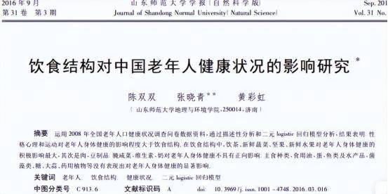 陈双双.饮食结构对中国老年人健康状况的影响研究, 山东师范大学学报(自然科学版), 2016-09-15