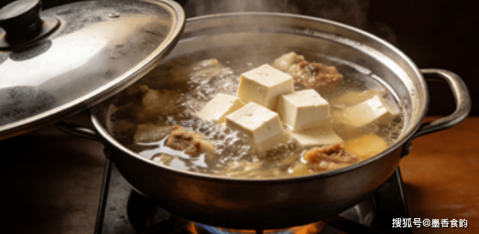 汤烧开后,把切好的豆腐块轻轻滑进去。调中小火,盖上盖子,老老实实炖它10-15分钟。让豆腐的空隙吸饱肉汤的精华。