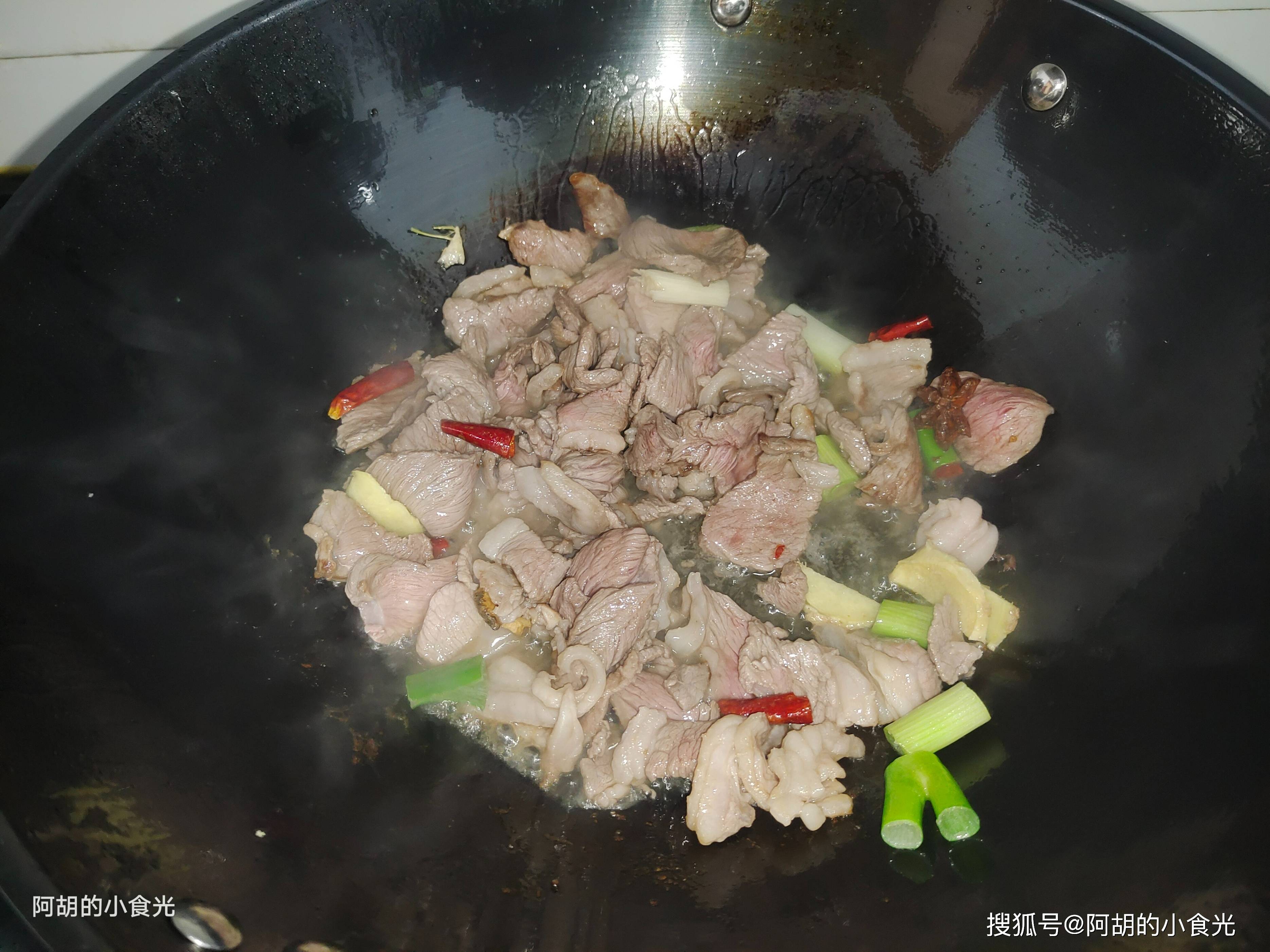 第三步:食材都很简单,准备完毕后就可以开火烹饪了。先是小火把锅烘干,淋入一些菜籽油烧热,而后直接把鲜羊肉片倒入油锅中炒一炒,炒至变色、炒出羊肉的油脂后把葱姜干辣椒和八角叶倒入锅中,继续翻炒出香味。