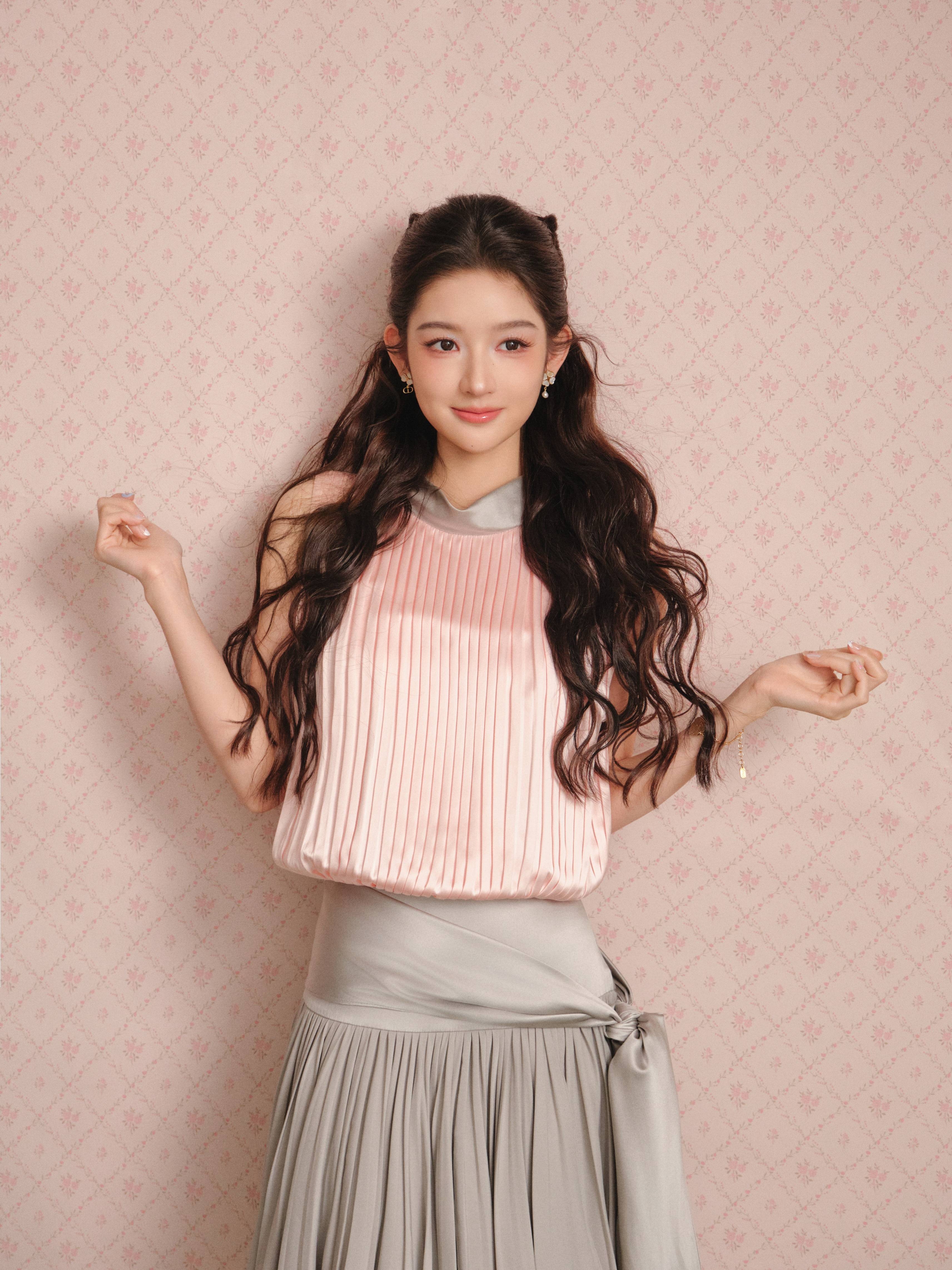 作为近年影视综艺双开花的95花代表,王玉雯凭借《少年派》中校花邓小琪的灵动、《微暗之火》里美艳人妻的张力,早已证明其驾驭多元风格的能力。此次活动,团队大胆摒弃常规礼服路线,选择以“童话感”为核心设计:蓬松卷发公主头用碎发修饰脸型,粉嫩系妆容突出苹果肌的饱满感,既保留少女的娇憨,又通过精致细节提升质感。
