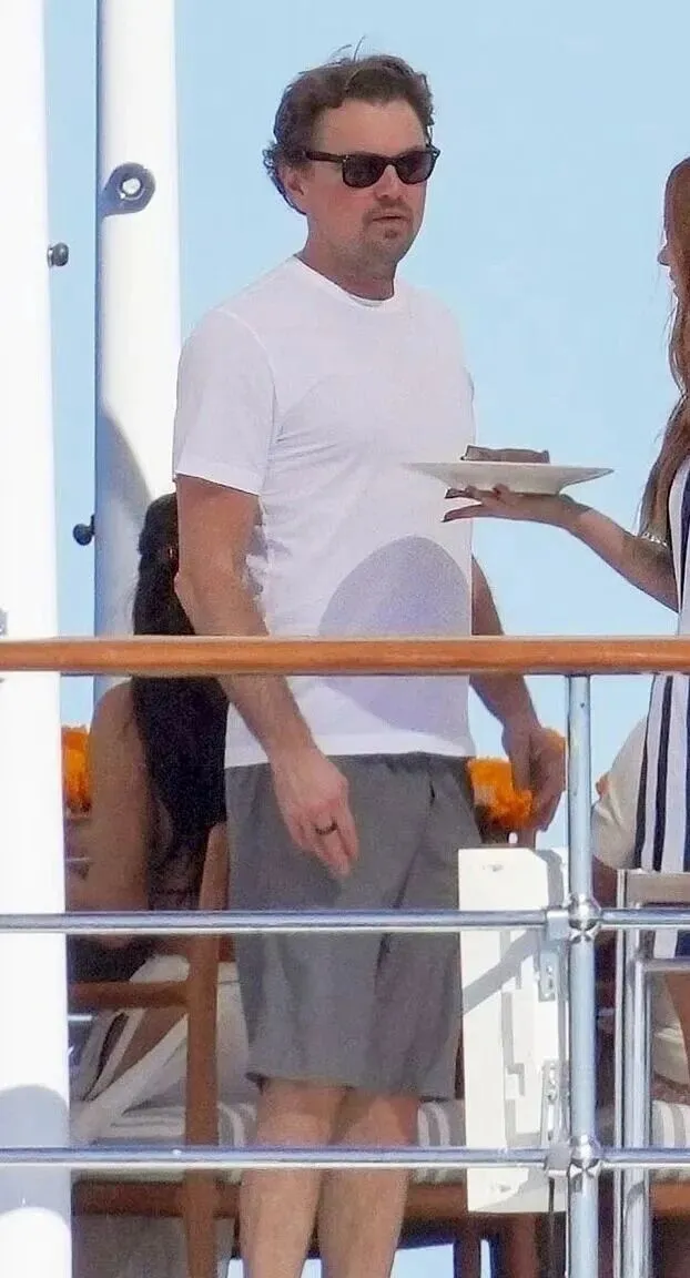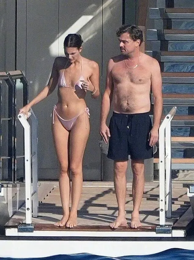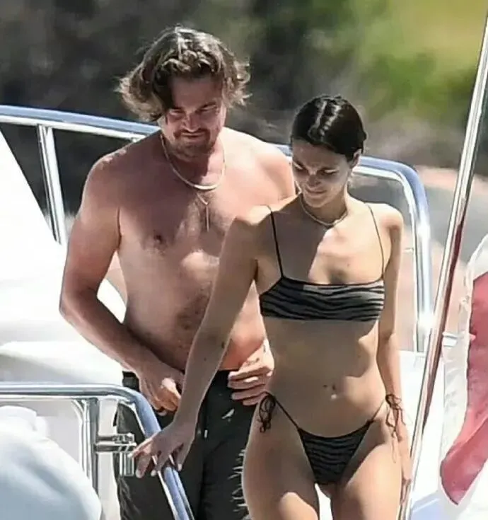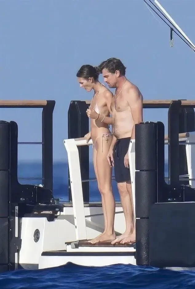 甜蜜互动曝光:两人在圣特罗佩海岸游艇上大笑嬉戏,小李子身着休闲短裤展露瘦身成果,维多利亚穿比基尼秀出黄金腰臀比,氛围轻松恩爱。