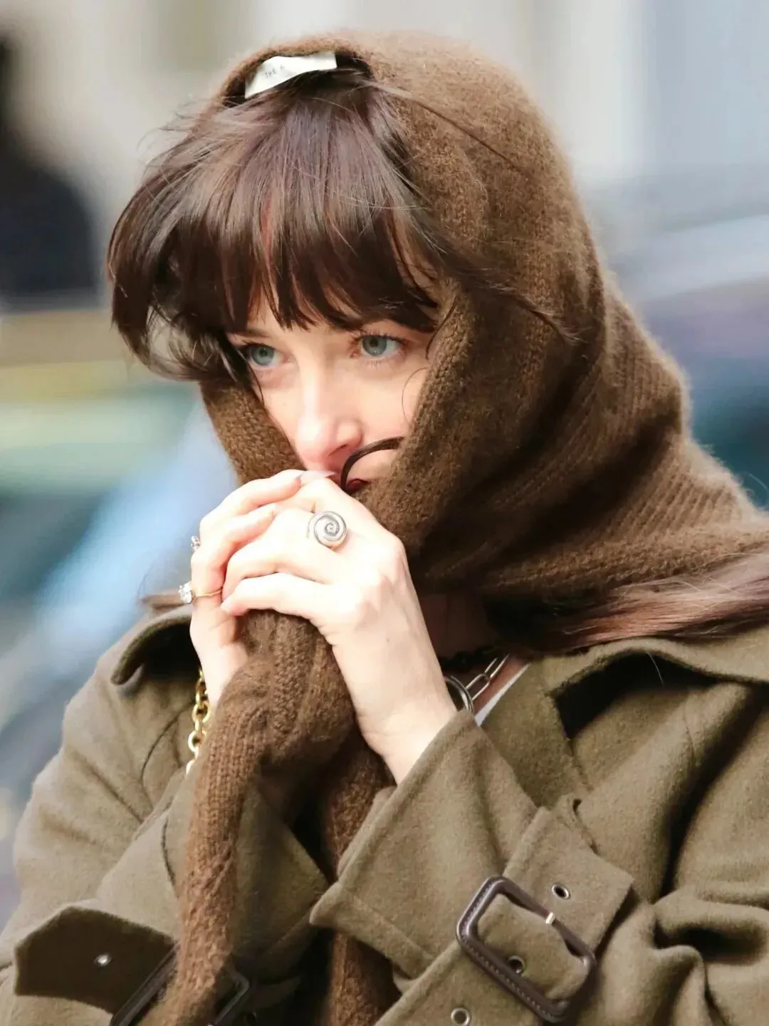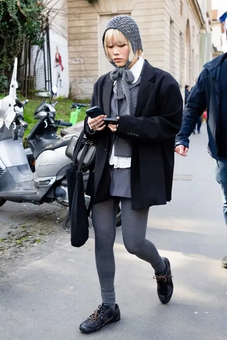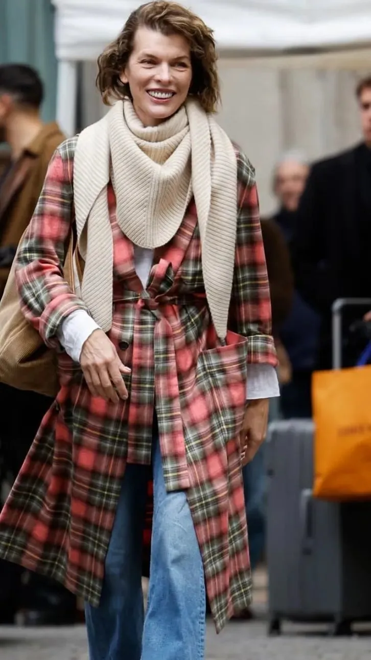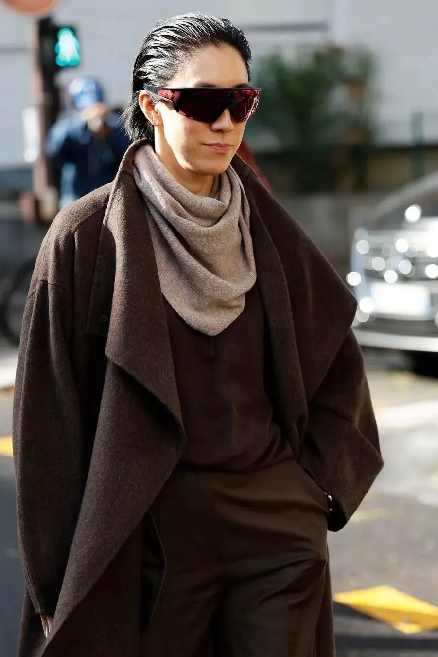 肯豆(Kendall Jenner):偏好极简主义,常以纯色三角围巾搭配修身裤装,突出短款设计对比例的优化,营造“上宽下窄”的利落感。