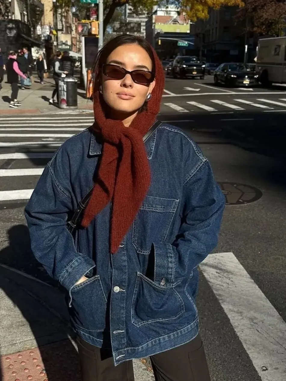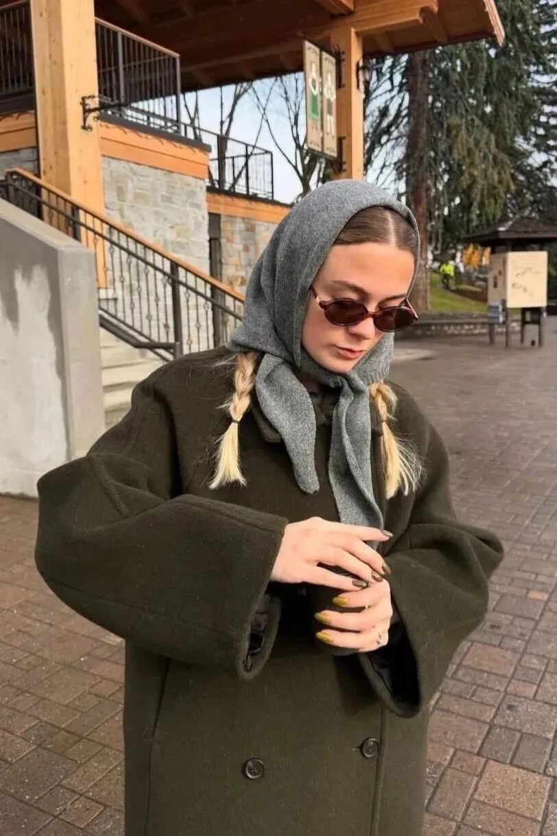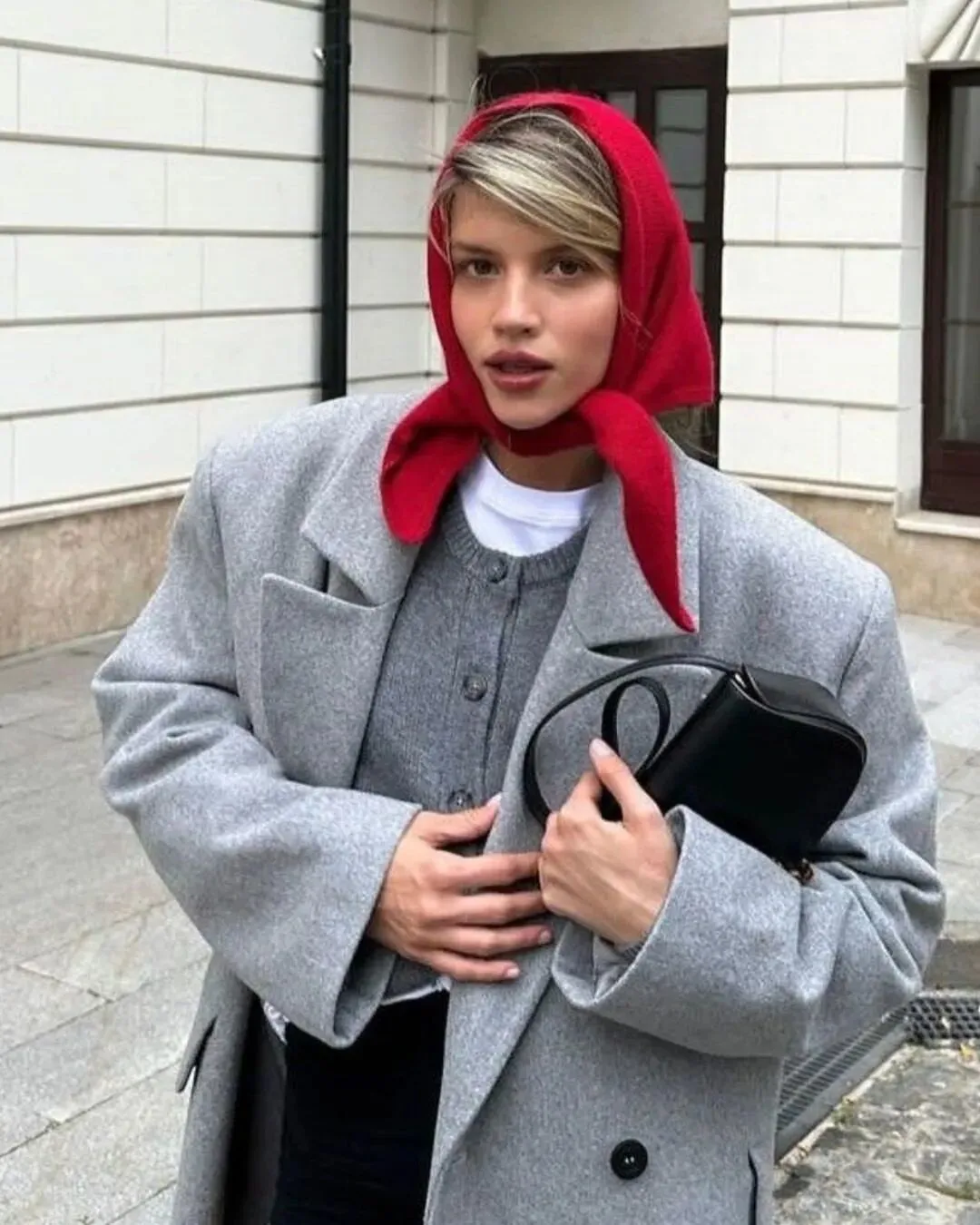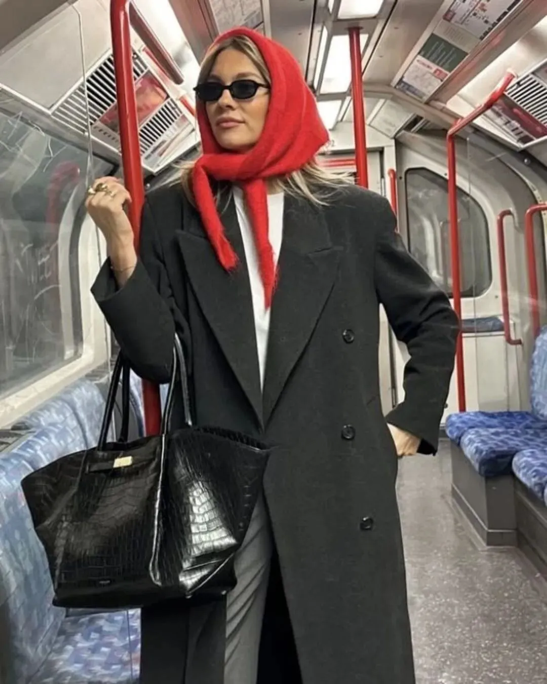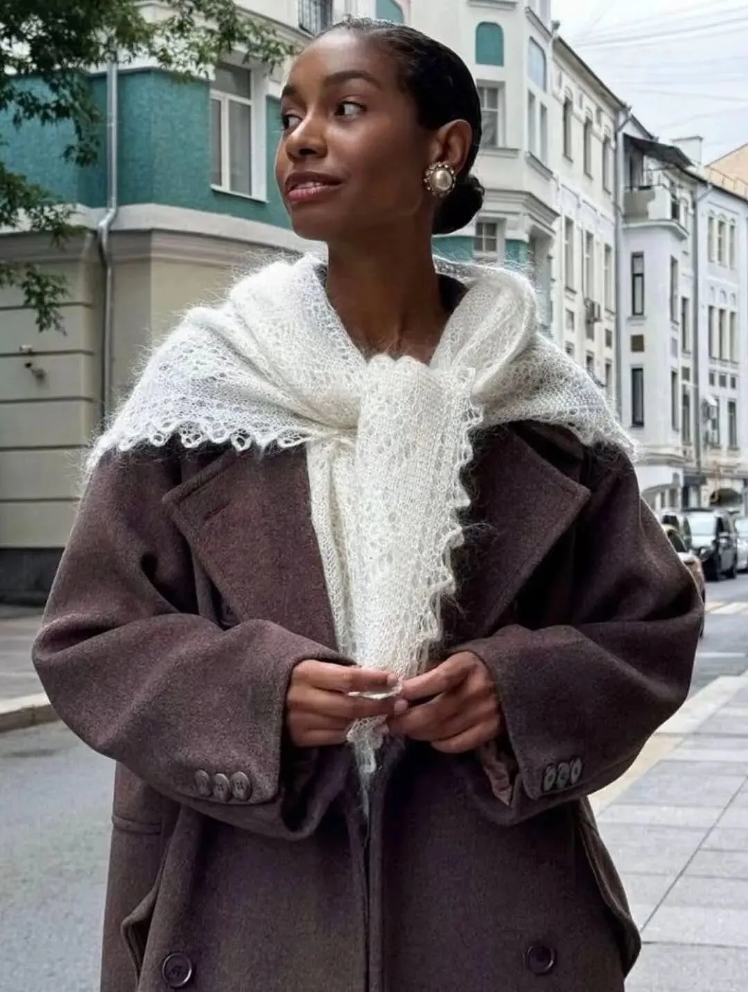 通勤风:高领毛衣 + 大衣 + 流苏三角巾 → 提升职业装高级感;