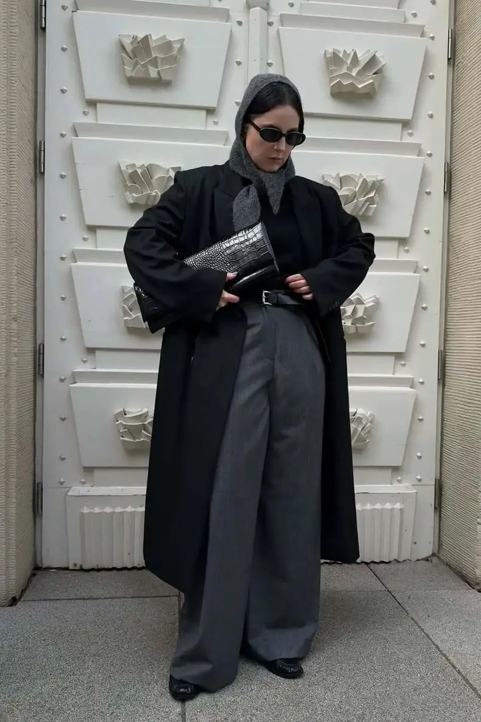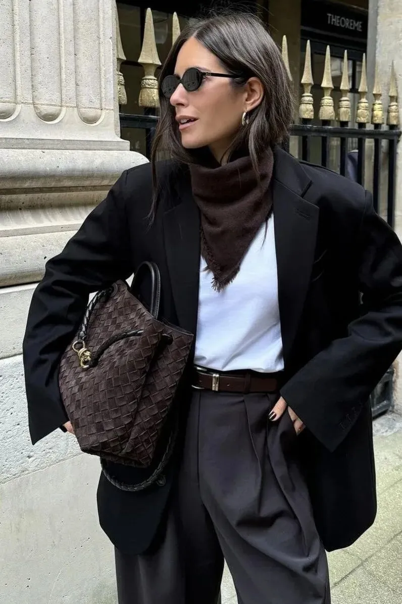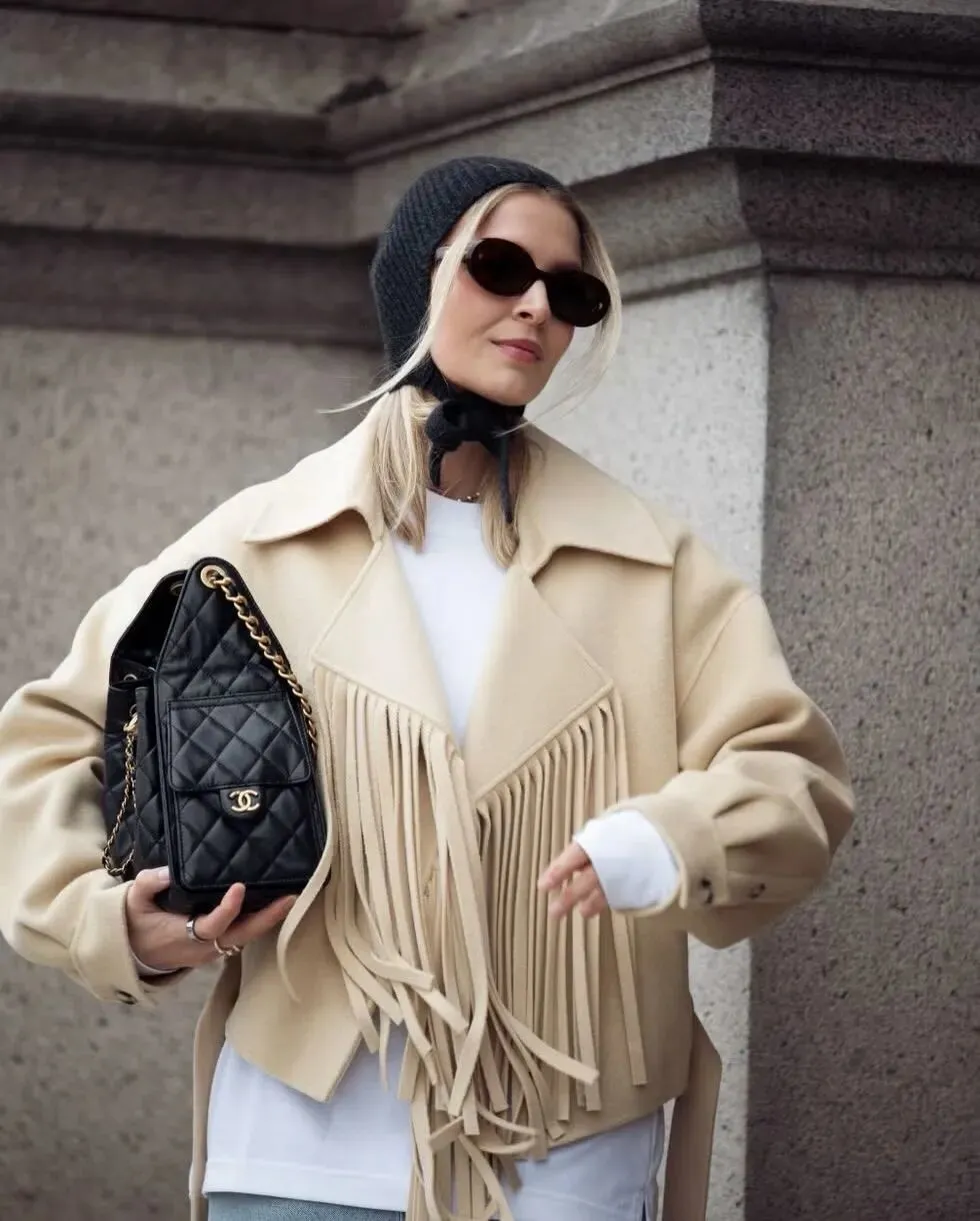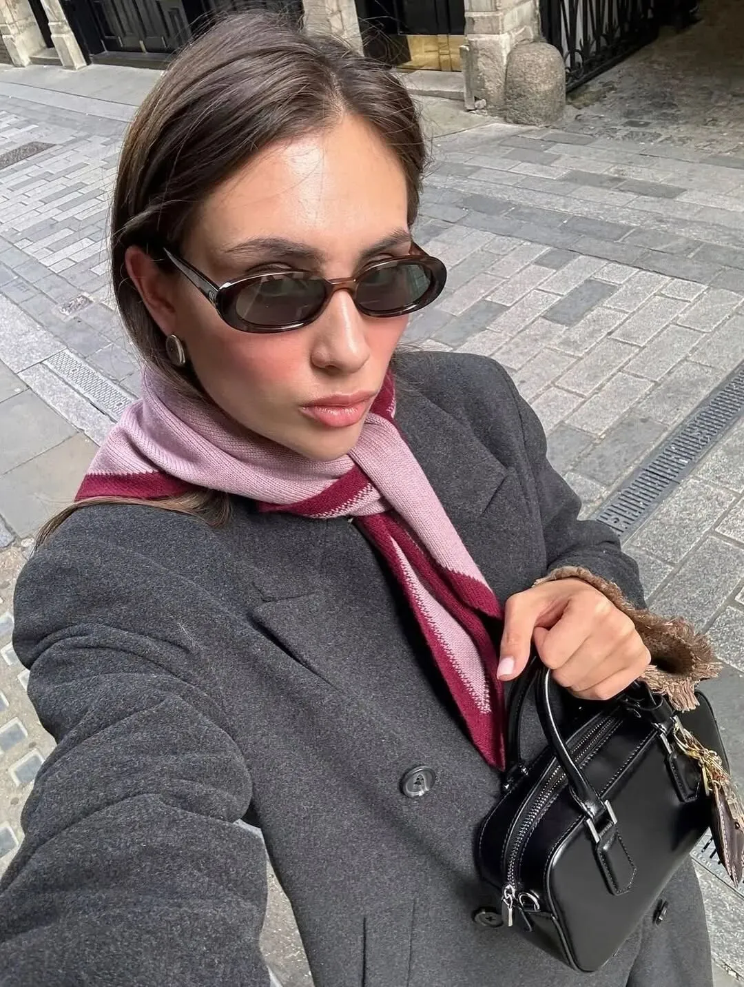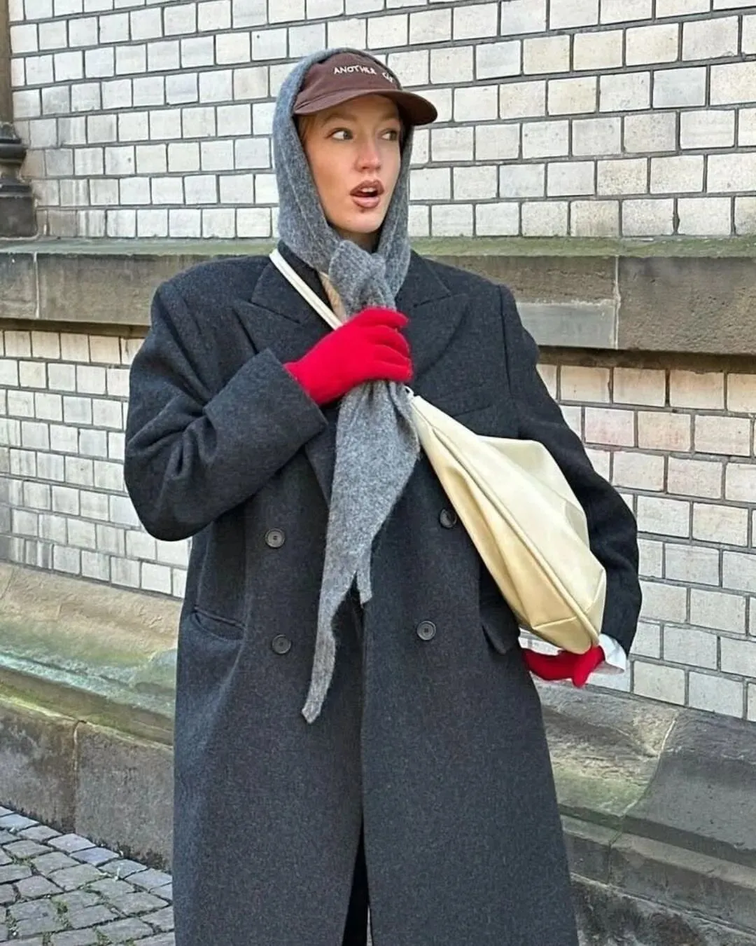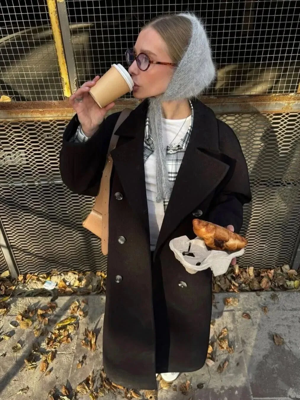 通勤风:高领毛衣 + 大衣 + 流苏三角巾 → 提升职业装高级感;
