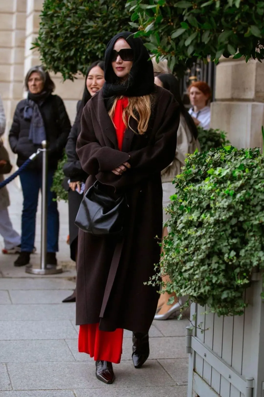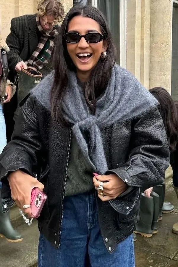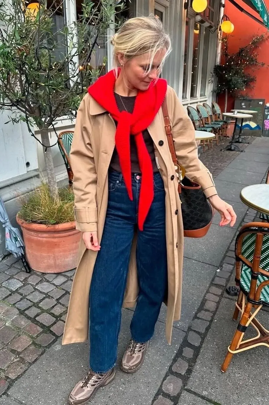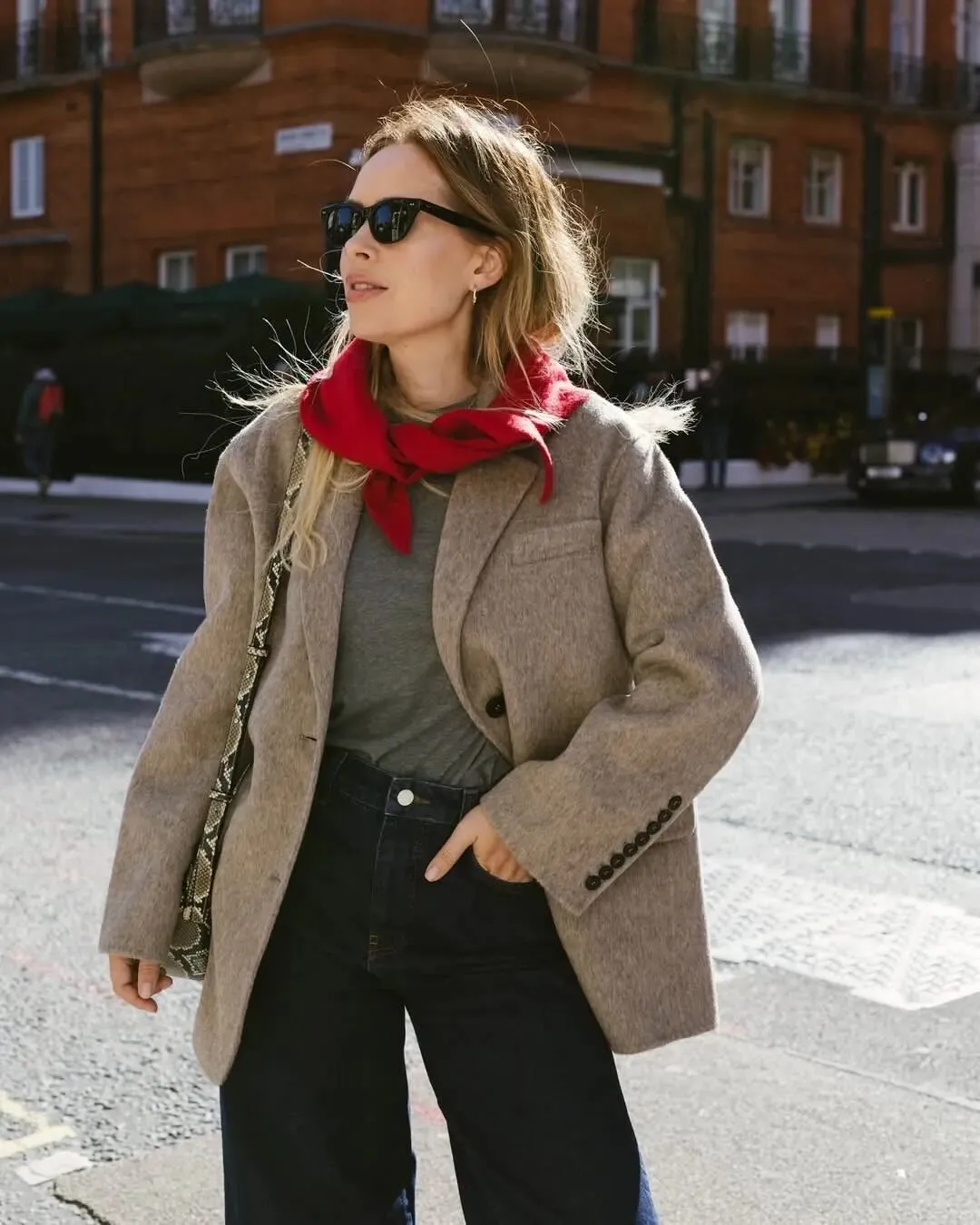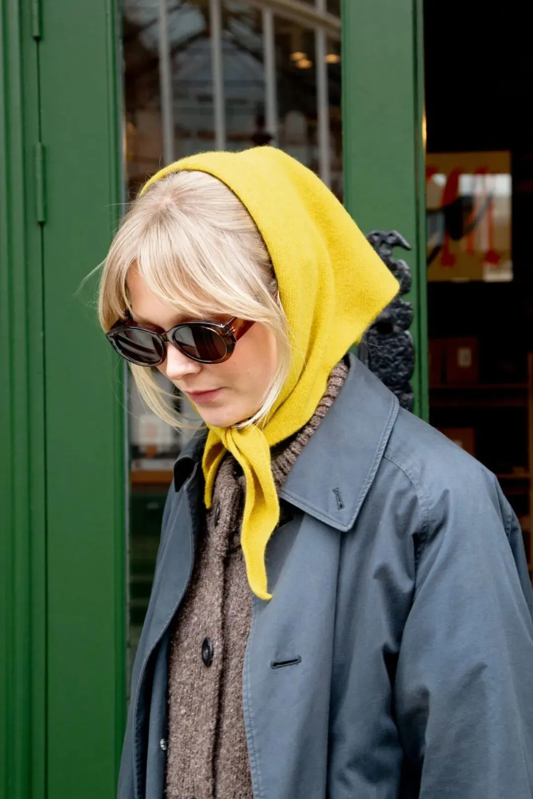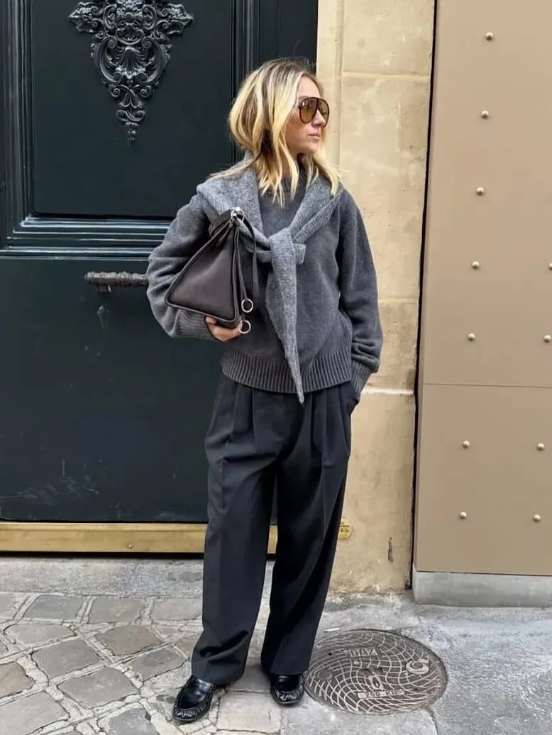 通勤风:高领毛衣 + 大衣 + 流苏三角巾 → 提升职业装高级感;