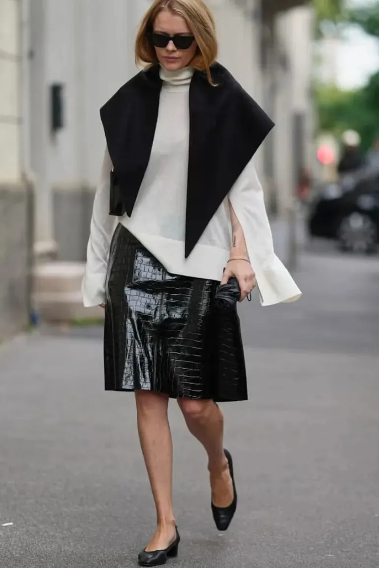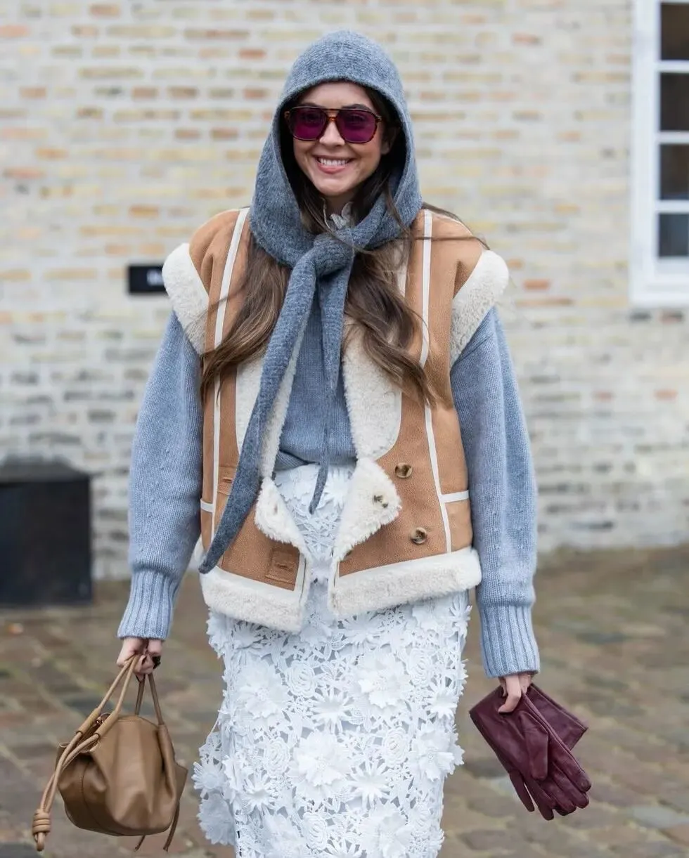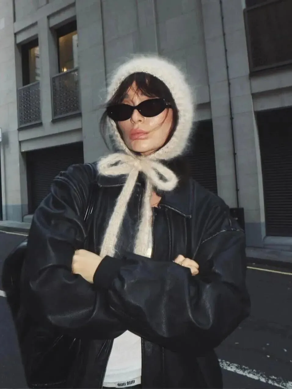 三角形结构自然形成视觉延伸,优化肩颈线条。羊毛混纺、蕾丝钩花等材质兼顾垂坠感与挺括度,既显轻盈又避免臃肿,尤其适合叠穿时塑造层次。
