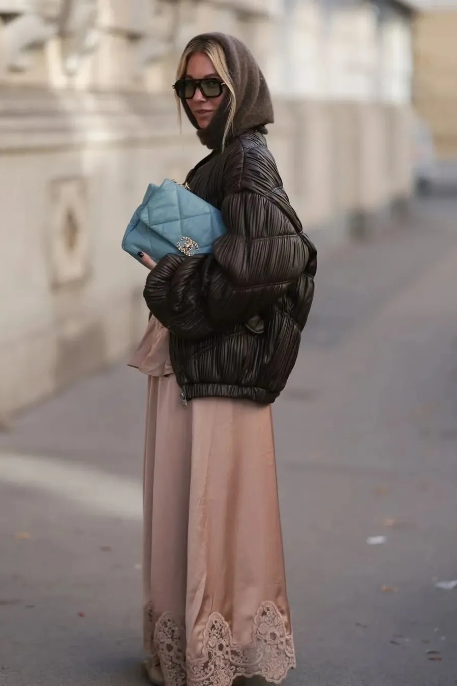 户外场景:羽绒服 + 护颈式三角围脖 → 兼顾防风性与时尚度。