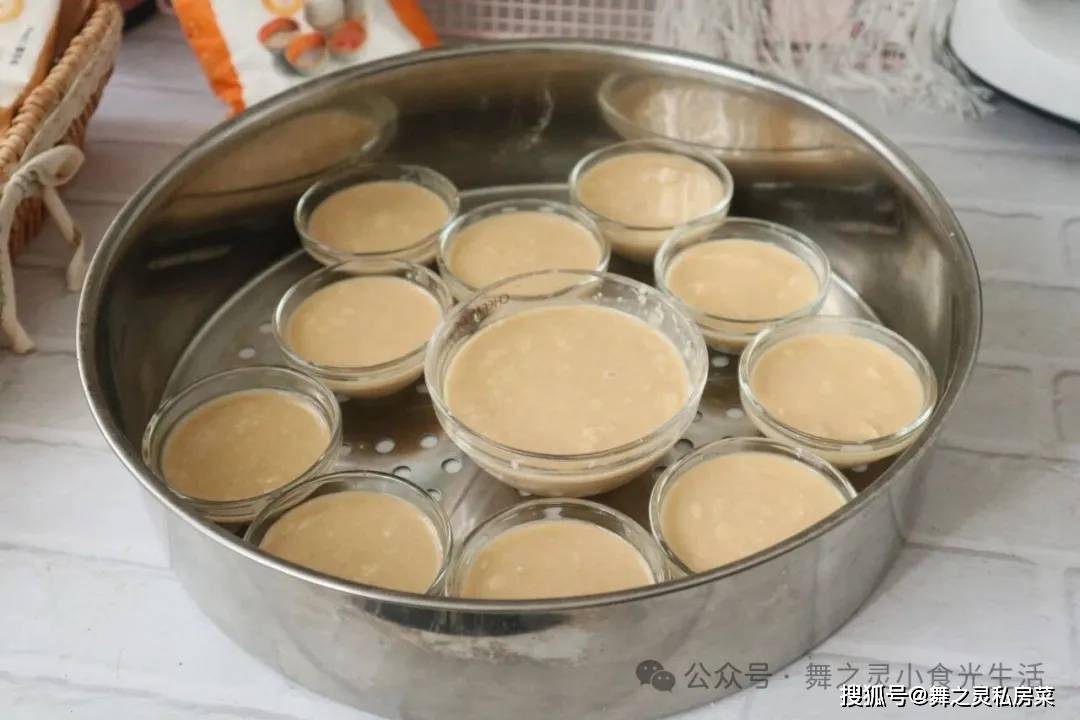 5、提前准备一些钵仔糕小碗,然后把准备好的粉浆倒入,以8分满即可