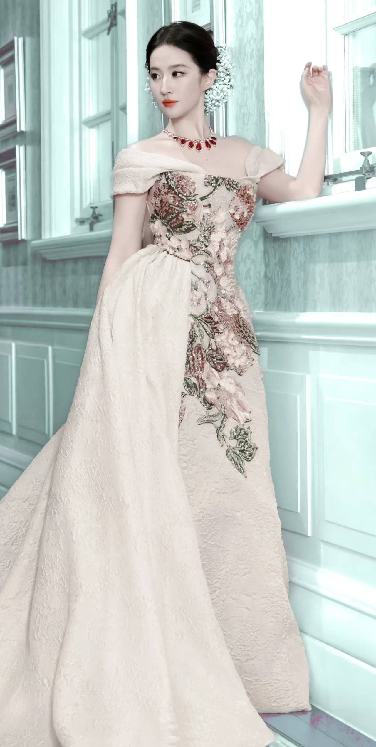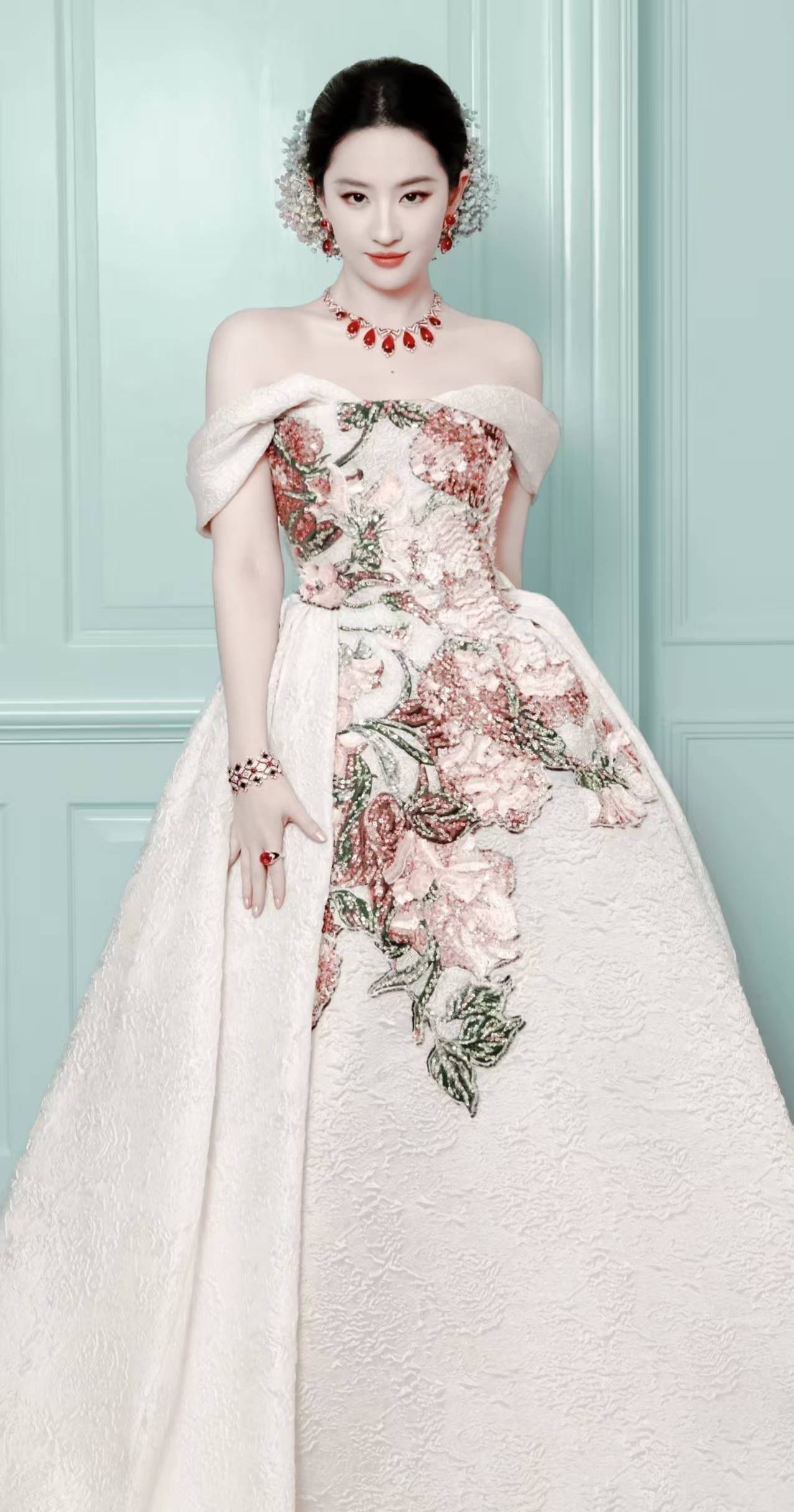 姐妹们快来品品刘亦菲的新造型!这姐直接把巴洛克油画穿在了身上!一袭白色露肩长裙上绣满粉色牡丹,头发上别着满天星花环,脖子上戴着红宝石项链,站在蓝色背景前,活脱脱从文艺复兴油画里走出来的贵族小姐,美得让人失语!先看这裙子设计太绝了!白色蕾丝裙身布满立体浮雕花纹,像用奶油裱出来的花瓣,腰间和裙摆上绣着大朵粉色牡丹,每片花瓣都缀着细闪,在灯光下像撒了一把碎钻。露肩设计露出精致的锁骨和肩颈线条,袖子是可拆卸的花苞袖,想甜想飒一键切换。裙摆拖在地上像云朵一样轻盈,走动时牡丹刺绣跟着轻轻颤动,仿佛下一秒就要开出真花来!配饰更是华丽到犯规!脖子上这条红宝石项链简直闪瞎眼,水滴形红宝吊坠配上钻石枝叶,衬得她皮肤白到发光。耳朵上是同款红宝石耳环,耳尖还别着一小簇满天星,和头上的鲜花头饰遥相呼应。最绝的是她手上的红宝石戒指和手镯,和项链耳环形成全套look,贵气又不会显得刻意,这才是真正的"人间富贵花"啊!妆容也美得恰到好处!野生眉透着自然英气,眼尾用深棕色眼影拉长,睫毛刷得根根分明像小扇子。唇釉选了复古正红色,和红宝石首饰简直是天作之合。她的发际线也太优越了,乌黑浓密的头发盘成低发髻,上面别着蓝白渐变的满天星花环,碎发垂在脸颊,既有古典油画的精致感,又带着点少女的灵动。静态硬照已经美到窒息,动态视频更绝!她站在窗边抬手整理头发时,露肩裙滑落肩头,露出白皙的肩膀,阳光透过窗户洒在她身上,连绒毛都看得清清楚楚。还有个镜头是她低头浅笑,红宝石项链垂在胸前,和裙上的牡丹刺绣相映成趣,这画面感简直绝了,我直接循环播放十遍!不得不说刘亦菲太适合这种古典风了!之前总觉得她是清冷挂仙女,没想到驾驭起这种华丽油画风也这么得心应手。白色裙装配红色宝石,经典又高级,鲜花头饰增添了几分浪漫感,每个细节都长在审美点上。而且这裙子超考验身材,换个人穿可能就是灾难现场,但刘亦菲穿上完全是量身定制,腰细得像A4纸,肩颈线条流畅得像天鹅,说是二十岁都有人信!看完这组图我直接被圈粉,这才是内娱红毯该有的样子啊!有颜值有身材有品味,关键是还很会拍,每个姿势都透着优雅和贵气。姐妹们快去存图当壁纸,这组真的每一帧都可以封神,用来当头像朋友圈背景都超有排面,让你秒变朋友圈最靓的崽!
