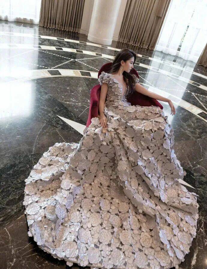 她穿的那条银灰色立体花朵礼裙,我一眼就沦陷了。这裙子就像是把整个花园都浓缩在了上面,每一片花瓣都像是被神仙用魔法精心雕琢出来的。那银灰色的色调,高级又神秘,仿佛藏着无尽的宇宙奥秘。