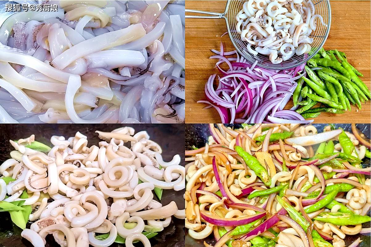 1. 鱿鱼切花刀或条,焯水至卷曲捞出;洋葱、青椒切丝。