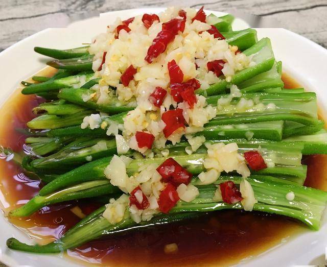 用料:秋葵250克;蒜蓉10克;指天椒2个;盐2克;油5克;辣椒面3克;生抽5克;蚝油3克;白糖2克;