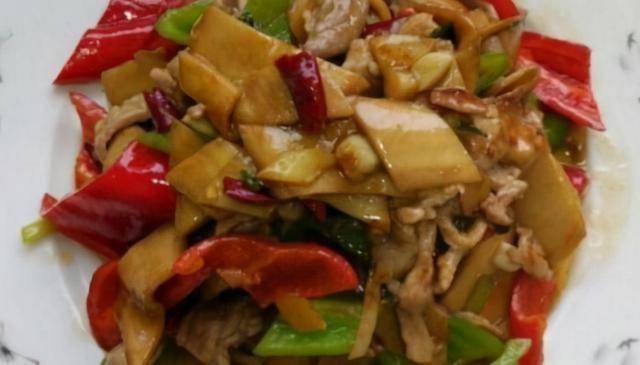 5.大火继续翻炒1分钟,加入青红椒丝、葱段翻炒至断生即可。