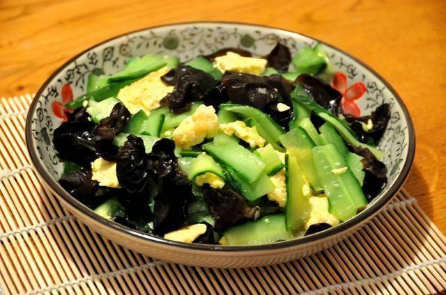 4、再次热锅倒油,葱花儿爆锅,放木耳进去翻炒,之后放鸡蛋,最后放切好的黄瓜