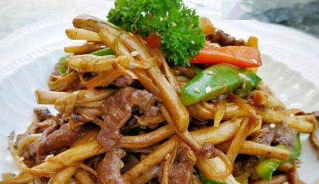 材料:茶树菇、牛肉、青圆椒、红圆椒、红葱头、小葱、姜、蒜、糖、盐、蚝油、老抽、胡椒粉、料酒、生粉、酱油